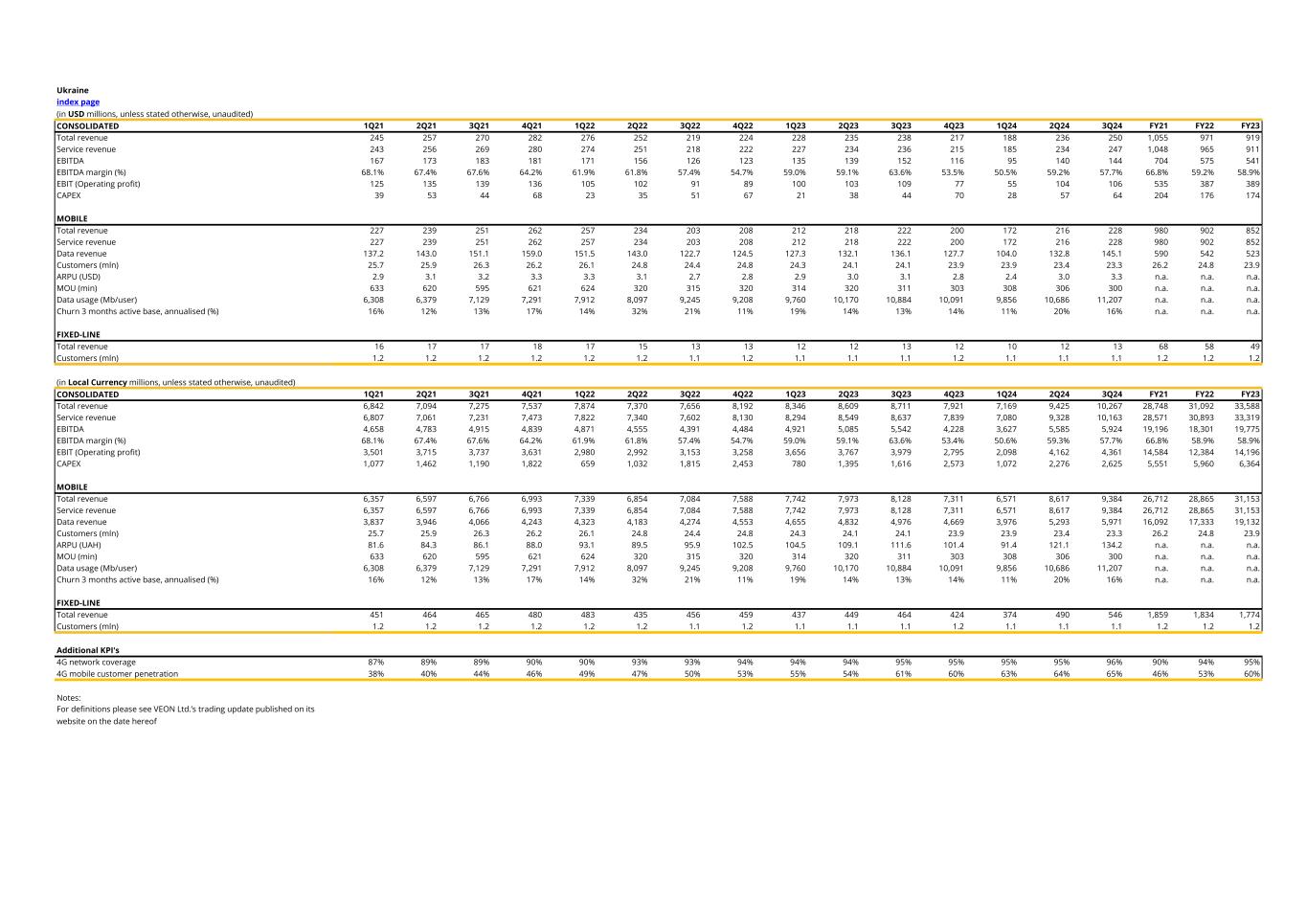 Ukraine index page (in USD millions, unless stated otherwise, unaudited) CONSOLIDATED 1Q21 2Q21 3Q21 4Q21 1Q22 2Q22 3Q22 4Q22 1Q23 2Q23 3Q23 4Q23 1Q24 2Q24 3Q24 FY21 FY22 FY23 Total revenue 245 257 270 282 276 252 219 224 228 235 238 217 188 236 250 1,055 971 919 Service revenue 243 256 269 280 274 251 218 222 227 234 236 215 185 234 247 1,048 965 911 EBITDA 167 173 183 181 171 156 126 123 135 139 152 116 95 140 144 704 575 541 EBITDA margin (%) 68.1% 67.4% 67.6% 64.2% 61.9% 61.8% 57.4% 54.7% 59.0% 59.1% 63.6% 53.5% 50.5% 59.2% 57.7% 66.8% 59.2% 58.9% EBIT (Operating profit) 125 135 139 136 105 102 91 89 100 103 109 77 55 104 106 535 387 389 CAPEX 39 53 44 68 23 35 51 67 21 38 44 70 28 57 64 204 176 174 MOBILE Total revenue 227 239 251 262 257 234 203 208 212 218 222 200 172 216 228 980 902 852 Service revenue 227 239 251 262 257 234 203 208 212 218 222 200 172 216 228 980 902 852 Data revenue 137.2 143.0 151.1 159.0 151.5 143.0 122.7 124.5 127.3 132.1 136.1 127.7 104.0 132.8 145.1 590 542 523 Customers (mln) 25.7 25.9 26.3 26.2 26.1 24.8 24.4 24.8 24.3 24.1 24.1 23.9 23.9 23.4 23.3 26.2 24.8 23.9 ARPU (USD) 2.9 3.1 3.2 3.3 3.3 3.1 2.7 2.8 2.9 3.0 3.1 2.8 2.4 3.0 3.3 n.a. n.a. n.a. MOU (min) 633 620 595 621 624 320 315 320 314 320 311 303 308 306 300 n.a. n.a. n.a. Data usage (Mb/user) 6,308 6,379 7,129 7,291 7,912 8,097 9,245 9,208 9,760 10,170 10,884 10,091 9,856 10,686 11,207 n.a. n.a. n.a. Churn 3 months active base, annualised (%) 16% 12% 13% 17% 14% 32% 21% 11% 19% 14% 13% 14% 11% 20% 16% n.a. n.a. n.a. FIXED-LINE Total revenue 16 17 17 18 17 15 13 13 12 12 13 12 10 12 13 68 58 49 Customers (mln) 1.2 1.2 1.2 1.2 1.2 1.2 1.1 1.2 1.1 1.1 1.1 1.2 1.1 1.1 1.1 1.2 1.2 1.2 (in Local Currency millions, unless stated otherwise, unaudited) CONSOLIDATED 1Q21 2Q21 3Q21 4Q21 1Q22 2Q22 3Q22 4Q22 1Q23 2Q23 3Q23 4Q23 1Q24 2Q24 3Q24 FY21 FY22 FY23 Total revenue 6,842 7,094 7,275 7,537 7,874 7,370 7,656 8,192 8,346 8,609 8,711 7,921 7,169 9,425 10,267 28,748 31,092 33,588 Service revenue 6,807 7,061 7,231 7,473 7,822 7,340 7,602 8,130 8,294 8,549 8,637 7,839 7,080 9,328 10,163 28,571 30,893 33,319 EBITDA 4,658 4,783 4,915 4,839 4,871 4,555 4,391 4,484 4,921 5,085 5,542 4,228 3,627 5,585 5,924 19,196 18,301 19,775 EBITDA margin (%) 68.1% 67.4% 67.6% 64.2% 61.9% 61.8% 57.4% 54.7% 59.0% 59.1% 63.6% 53.4% 50.6% 59.3% 57.7% 66.8% 58.9% 58.9% EBIT (Operating profit) 3,501 3,715 3,737 3,631 2,980 2,992 3,153 3,258 3,656 3,767 3,979 2,795 2,098 4,162 4,361 14,584 12,384 14,196 CAPEX 1,077 1,462 1,190 1,822 659 1,032 1,815 2,453 780 1,395 1,616 2,573 1,072 2,276 2,625 5,551 5,960 6,364 MOBILE Total revenue 6,357 6,597 6,766 6,993 7,339 6,854 7,084 7,588 7,742 7,973 8,128 7,311 6,571 8,617 9,384 26,712 28,865 31,153 Service revenue 6,357 6,597 6,766 6,993 7,339 6,854 7,084 7,588 7,742 7,973 8,128 7,311 6,571 8,617 9,384 26,712 28,865 31,153 Data revenue 3,837 3,946 4,066 4,243 4,323 4,183 4,274 4,553 4,655 4,832 4,976 4,669 3,976 5,293 5,971 16,092 17,333 19,132 Customers (mln) 25.7 25.9 26.3 26.2 26.1 24.8 24.4 24.8 24.3 24.1 24.1 23.9 23.9 23.4 23.3 26.2 24.8 23.9 ARPU (UAH) 81.6 84.3 86.1 88.0 93.1 89.5 95.9 102.5 104.5 109.1 111.6 101.4 91.4 121.1 134.2 n.a. n.a. n.a. MOU (min) 633 620 595 621 624 320 315 320 314 320 311 303 308 306 300 n.a. n.a. n.a. Data usage (Mb/user) 6,308 6,379 7,129 7,291 7,912 8,097 9,245 9,208 9,760 10,170 10,884 10,091 9,856 10,686 11,207 n.a. n.a. n.a. Churn 3 months active base, annualised (%) 16% 12% 13% 17% 14% 32% 21% 11% 19% 14% 13% 14% 11% 20% 16% n.a. n.a. n.a. FIXED-LINE Total revenue 451 464 465 480 483 435 456 459 437 449 464 424 374 490 546 1,859 1,834 1,774 Customers (mln) 1.2 1.2 1.2 1.2 1.2 1.2 1.1 1.2 1.1 1.1 1.1 1.2 1.1 1.1 1.1 1.2 1.2 1.2 Additional KPI's 4G network coverage 87% 89% 89% 90% 90% 93% 93% 94% 94% 94% 95% 95% 95% 95% 96% 90% 94% 95% 4G mobile customer penetration 38% 40% 44% 46% 49% 47% 50% 53% 55% 54% 61% 60% 63% 64% 65% 46% 53% 60% Notes: For definitions please see VEON Ltd.’s trading update published on its website on the date hereof