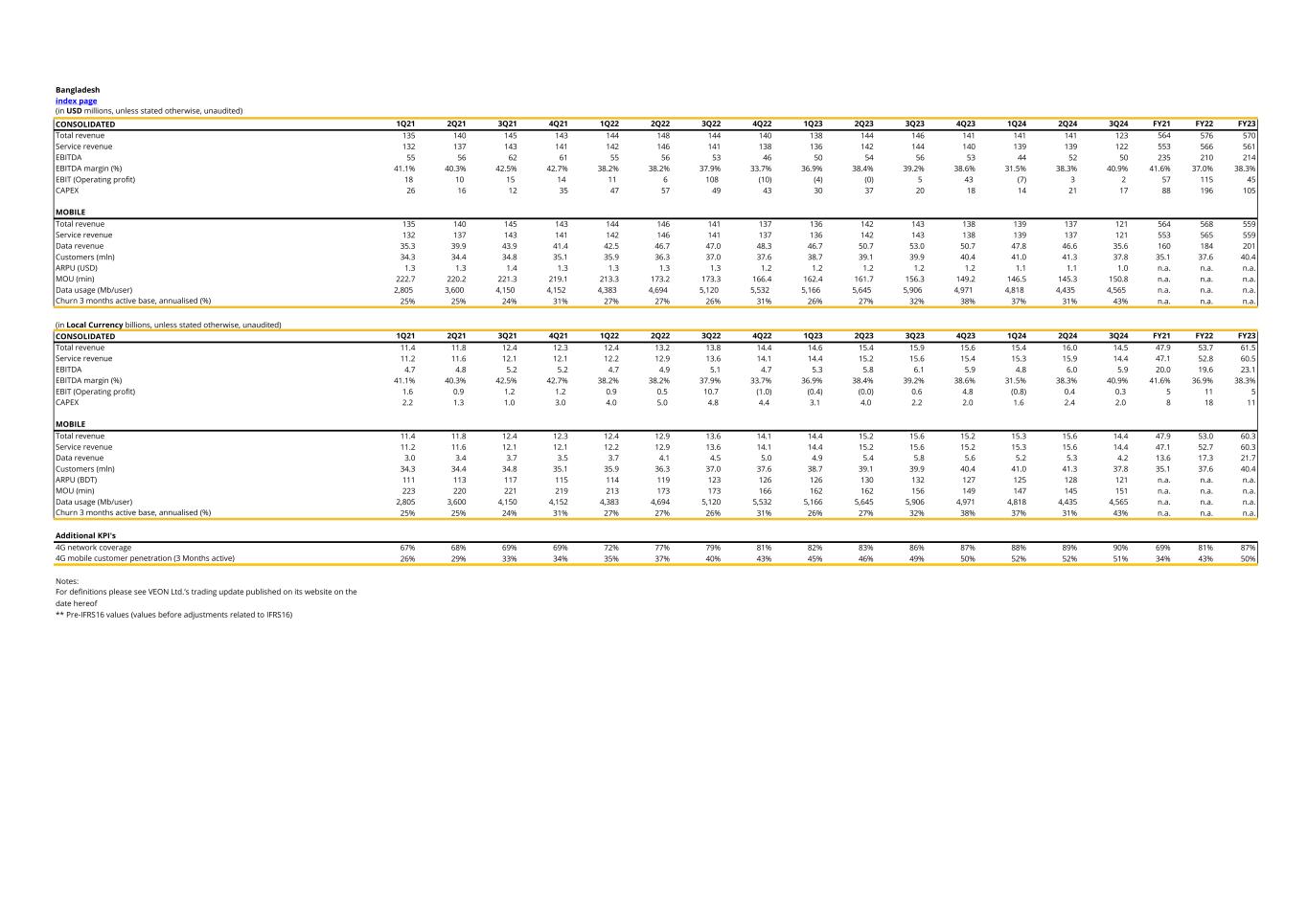 Bangladesh index page (in USD millions, unless stated otherwise, unaudited) CONSOLIDATED 1Q21 2Q21 3Q21 4Q21 1Q22 2Q22 3Q22 4Q22 1Q23 2Q23 3Q23 4Q23 1Q24 2Q24 3Q24 FY21 FY22 FY23 Total revenue 135 140 145 143 144 148 144 140 138 144 146 141 141 141 123 564 576 570 Service revenue 132 137 143 141 142 146 141 138 136 142 144 140 139 139 122 553 566 561 EBITDA 55 56 62 61 55 56 53 46 50 54 56 53 44 52 50 235 210 214 EBITDA margin (%) 41.1% 40.3% 42.5% 42.7% 38.2% 38.2% 37.9% 33.7% 36.9% 38.4% 39.2% 38.6% 31.5% 38.3% 40.9% 41.6% 37.0% 38.3% EBIT (Operating profit) 18 10 15 14 11 6 108 (10) (4) (0) 5 43 (7) 3 2 57 115 45 CAPEX 26 16 12 35 47 57 49 43 30 37 20 18 14 21 17 88 196 105 MOBILE Total revenue 135 140 145 143 144 146 141 137 136 142 143 138 139 137 121 564 568 559 Service revenue 132 137 143 141 142 146 141 137 136 142 143 138 139 137 121 553 565 559 Data revenue 35.3 39.9 43.9 41.4 42.5 46.7 47.0 48.3 46.7 50.7 53.0 50.7 47.8 46.6 35.6 160 184 201 Customers (mln) 34.3 34.4 34.8 35.1 35.9 36.3 37.0 37.6 38.7 39.1 39.9 40.4 41.0 41.3 37.8 35.1 37.6 40.4 ARPU (USD) 1.3 1.3 1.4 1.3 1.3 1.3 1.3 1.2 1.2 1.2 1.2 1.2 1.1 1.1 1.0 n.a. n.a. n.a. MOU (min) 222.7 220.2 221.3 219.1 213.3 173.2 173.3 166.4 162.4 161.7 156.3 149.2 146.5 145.3 150.8 n.a. n.a. n.a. Data usage (Mb/user) 2,805 3,600 4,150 4,152 4,383 4,694 5,120 5,532 5,166 5,645 5,906 4,971 4,818 4,435 4,565 n.a. n.a. n.a. Churn 3 months active base, annualised (%) 25% 25% 24% 31% 27% 27% 26% 31% 26% 27% 32% 38% 37% 31% 43% n.a. n.a. n.a. (in Local Currency billions, unless stated otherwise, unaudited) CONSOLIDATED 1Q21 2Q21 3Q21 4Q21 1Q22 2Q22 3Q22 4Q22 1Q23 2Q23 3Q23 4Q23 1Q24 2Q24 3Q24 FY21 FY22 FY23 Total revenue 11.4 11.8 12.4 12.3 12.4 13.2 13.8 14.4 14.6 15.4 15.9 15.6 15.4 16.0 14.5 47.9 53.7 61.5 Service revenue 11.2 11.6 12.1 12.1 12.2 12.9 13.6 14.1 14.4 15.2 15.6 15.4 15.3 15.9 14.4 47.1 52.8 60.5 EBITDA 4.7 4.8 5.2 5.2 4.7 4.9 5.1 4.7 5.3 5.8 6.1 5.9 4.8 6.0 5.9 20.0 19.6 23.1 EBITDA margin (%) 41.1% 40.3% 42.5% 42.7% 38.2% 38.2% 37.9% 33.7% 36.9% 38.4% 39.2% 38.6% 31.5% 38.3% 40.9% 41.6% 36.9% 38.3% EBIT (Operating profit) 1.6 0.9 1.2 1.2 0.9 0.5 10.7 (1.0) (0.4) (0.0) 0.6 4.8 (0.8) 0.4 0.3 5 11 5 CAPEX 2.2 1.3 1.0 3.0 4.0 5.0 4.8 4.4 3.1 4.0 2.2 2.0 1.6 2.4 2.0 8 18 11 MOBILE Total revenue 11.4 11.8 12.4 12.3 12.4 12.9 13.6 14.1 14.4 15.2 15.6 15.2 15.3 15.6 14.4 47.9 53.0 60.3 Service revenue 11.2 11.6 12.1 12.1 12.2 12.9 13.6 14.1 14.4 15.2 15.6 15.2 15.3 15.6 14.4 47.1 52.7 60.3 Data revenue 3.0 3.4 3.7 3.5 3.7 4.1 4.5 5.0 4.9 5.4 5.8 5.6 5.2 5.3 4.2 13.6 17.3 21.7 Customers (mln) 34.3 34.4 34.8 35.1 35.9 36.3 37.0 37.6 38.7 39.1 39.9 40.4 41.0 41.3 37.8 35.1 37.6 40.4 ARPU (BDT) 111 113 117 115 114 119 123 126 126 130 132 127 125 128 121 n.a. n.a. n.a. MOU (min) 223 220 221 219 213 173 173 166 162 162 156 149 147 145 151 n.a. n.a. n.a. Data usage (Mb/user) 2,805 3,600 4,150 4,152 4,383 4,694 5,120 5,532 5,166 5,645 5,906 4,971 4,818 4,435 4,565 n.a. n.a. n.a. Churn 3 months active base, annualised (%) 25% 25% 24% 31% 27% 27% 26% 31% 26% 27% 32% 38% 37% 31% 43% n.a. n.a. n.a. Additional KPI's 4G network coverage 67% 68% 69% 69% 72% 77% 79% 81% 82% 83% 86% 87% 88% 89% 90% 69% 81% 87% 4G mobile customer penetration (3 Months active) 26% 29% 33% 34% 35% 37% 40% 43% 45% 46% 49% 50% 52% 52% 51% 34% 43% 50% Notes: For definitions please see VEON Ltd.’s trading update published on its website on the date hereof ** Pre-IFRS16 values (values before adjustments related to IFRS16)