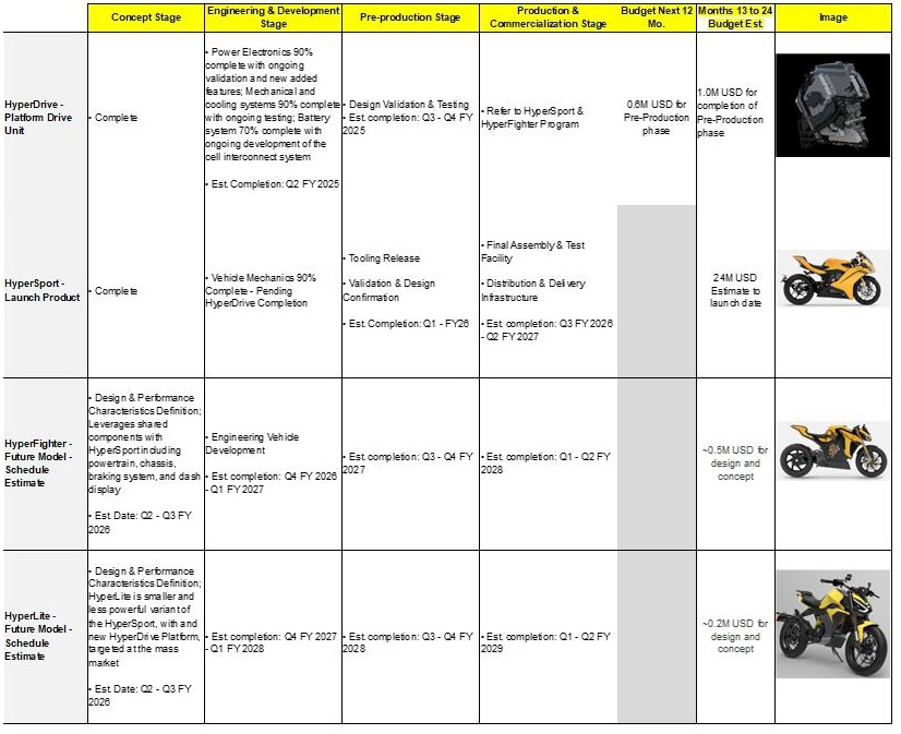 | ● | HyperSport: The Engineering & Development of the HyperSport is mostly complete, with vehicle mechanics 90% finalized, pending the completion of the HyperDrive platform. The pre-production stage is set to commence, with tooling release as a critical milestone, followed by validation and design confirmation, with an estimated completion by Q1 FY 2026. The Production & Commercialization Stage is ongoing in parallel, focusing on the establishment of the final assembly and test facility, along with the development of distribution and delivery infrastructure. This stage is expected to conclude between Q3 FY 2026 and Q2 FY 2027. The estimated budget for this program for the next 24 months is $24 million. |