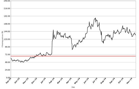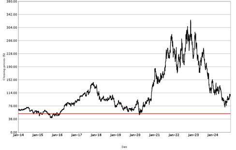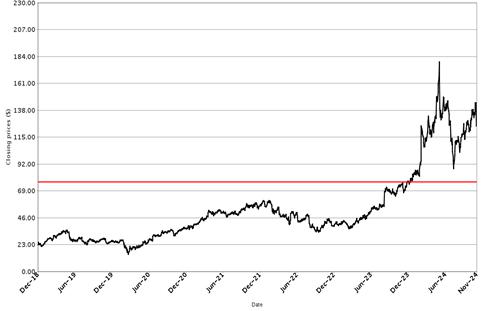 The following graphs set forth historical closing values of the Underlier for each offering for the period from January 1, 2014 (or from the initial listing date, if later) to November 29, 2024. Each red line represents a hypothetical Coupon Threshold and Barrier Value based on the closing value of the Underlier on November 29, 2024. We obtained the information in the graphs from Bloomberg Financial Markets, without independent investigation. We cannot give you assurance that the performance of the Underlier will result in the return of all of your initial investment.