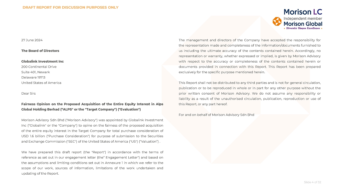 After careful consideration, Globalink’s board of directors has unanimously approved the Merger Agreement and unanimously recommends that Globalink’s stockholders vote “FOR” approval of each of the Proposals. When you consider the recommendation by Globalink’s board of directors of these Proposals, you should keep in mind that the Sponsor and Globalink’s directors and officers have interests in the Business Combination that may conflict or differ from your interests as a stockholder of Globalink. See the section titled “The Acquisition Merger Proposal (Proposal 2) — Interests of Certain Persons in the Business Combination.” Additionally, directors and officers of Alps Holdco have interests that may conflict or differ from your interests as a stockholder of Globalink as certain directors and officers of Alps Holdco are expected to receive certain number of PubCo ordinary shares issued as part of the Merger Consideration Shares. The Globalink Board does not plan to obtain a final fairness opinion related to the Business Combination. The Board has unanimously determined that the Business Combination is in the best interests of, and advisable to, the Globalink stockholders and recommends that the Globalink stockholders adopt the Merger Agreement and approve the Business Combination.
