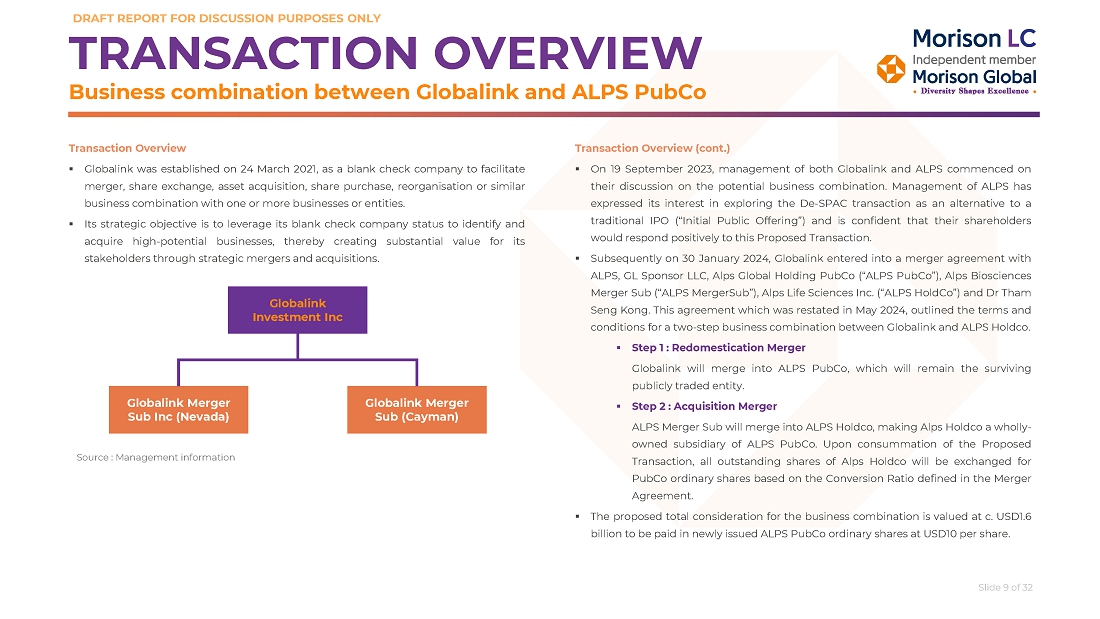 Pursuant to the terms of the Merger Agreement, the Business Combination between Globalink and Alps Holdco will be effected in two steps: (i) subject to the approval and adoption of the Merger Agreement by the stockholders of Globalink, Globalink will be merged with and into PubCo, with PubCo remaining as the surviving publicly traded entity (the “Redomestication Merger”); and (ii) Merger Sub will merge with and into Alps Holdco, resulting in Alps Holdco remaining as the surviving entity and being a wholly-owned subsidiary of PubCo (the “Acquisition Merger”). PubCo after the Business Combination is referred to in this proxy statement/prospectus as the “Combined Company.”