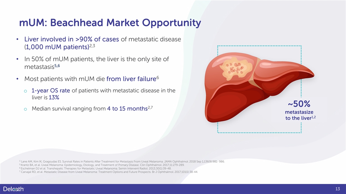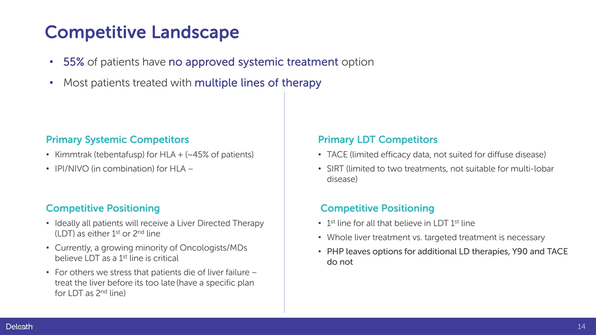 mUM: Beachhead Market Opportunity • Liver involved in >90% of cases of metastatic disease 2,3 (1,000 mUM patients) • In 50% of mUM patients, the liver is the only site of 5,6 metastasis 6 • Most patients with mUM die from liver failure o 1-year OS rate of patients with metastatic disease in the liver is 13% ~50% 2,7 o Median survival ranging from 4 to 15 months metastasize 1,2 to the liver 3 Lane AM, Kim IK, Gragoudas ES. Survival Rates in Patients After Treatment for Metastasis From Uveal Melanoma. JAMA Ophthalmol. 2018 Sep 1;136(9):981- 986. 5 Krantz BA, et al. Uveal Melanoma: Epidemiology, Etiology, and Treatment of Primary Disease. Clin Ophthalmol. 2017;11:279-289. 6 Eschelman DJ et al. Transhepatic Therapies for Metastatic Uveal Melanoma. Semin Intervent Radiol. 2013;30(1):39-48. 7 Carvajal RD, et al. Metastatic Disease from Uveal Melanoma: Treatment Options and Future Prospects. Br J Ophthalmol. 2017;101(1):38-44. 13