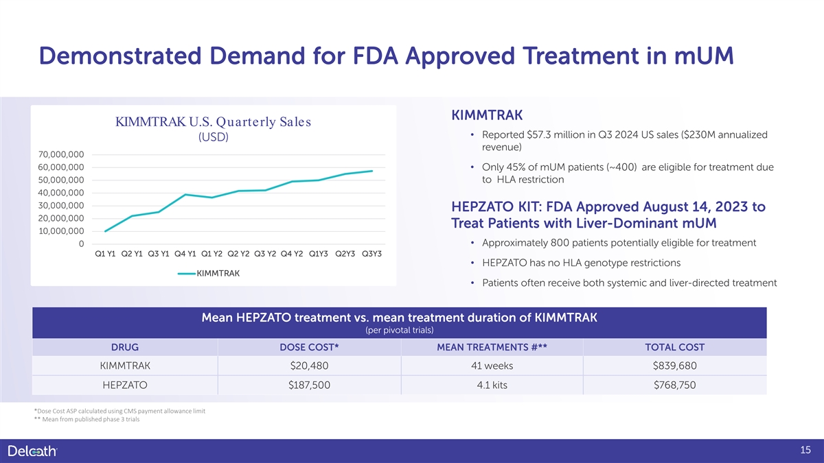 Competitive Landscape • 55% of patients have no approved systemic treatment option • Most patients treated with multiple lines of therapy Primary Systemic Competitors Primary LDT Competitors • Kimmtrak (tebentafusp) for HLA + (~45% of patients) • TACE (limited efficacy data, not suited for diffuse disease) • IPI/NIVO (in combination) for HLA – • SIRT (limited to two treatments, not suitable for multi-lobar disease) Competitive Positioning Competitive Positioning st st • Ideally all patients will receive a Liver Directed Therapy • 1 line for all that believe in LDT 1 line st nd (LDT) as either 1 or 2 line • Whole liver treatment vs. targeted treatment is necessary • Currently, a growing minority of Oncologists/MDs • PHP leaves options for additional LD therapies, Y90 and TACE st believe LDT as a 1 line is critical do not • For others we stress that patients die of liver failure – treat the liver before its too late (have a specific plan nd for LDT as 2 line) 14