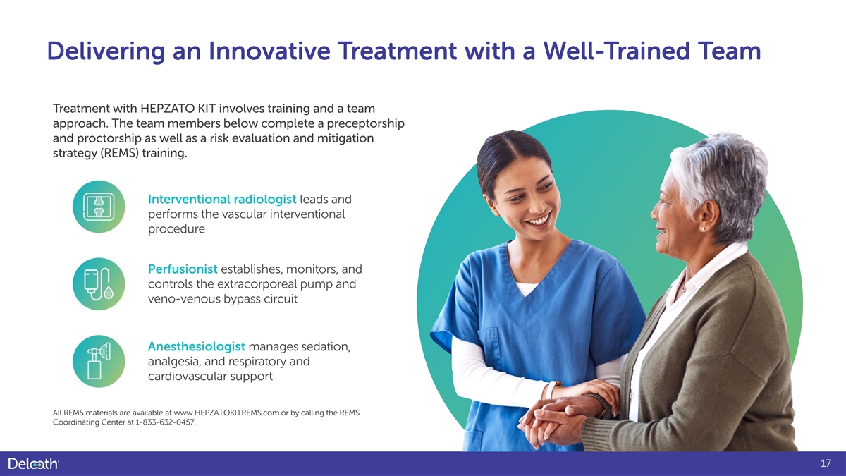 Delivering an Innovative Treatment with a Well-Trained Team Treatment with HEPZATO KIT involves training and a team approach. The team members below complete a preceptorship and proctorship as well as a risk evaluation and mitigation strategy (REMS) training. Interventional radiologist leads and performs the vascular interventional procedure Perfusionist establishes, monitors, and controls the extracorporeal pump and veno-venous bypass circuit Anesthesiologist manages sedation, analgesia, and respiratory and cardiovascular support All REMS materials are available at www.HEPZATOKITREMS.com or by calling the REMS Coordinating Center at 1-833-632-0457. 17