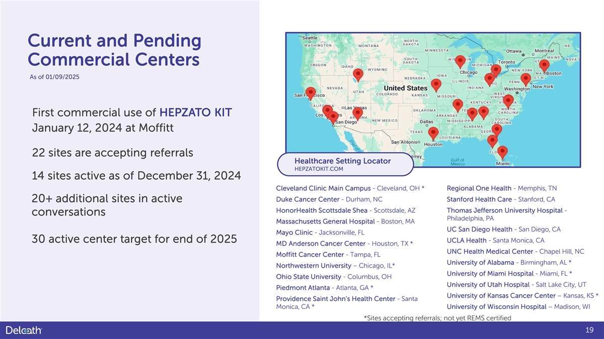Current and Pending Commercial Centers As of 01/09/2025 First commercial use of HEPZATO KIT January 12, 2024 at Moffitt 22 sites are accepting referrals Healthcare Setting Locator HEPZATOKIT.COM 14 sites active as of December 31, 2024 Cleveland Clinic Main Campus - Cleveland, OH * Regional One Health - Memphis, TN Duke Cancer Center - Durham, NC Stanford Health Care - Stanford, CA 20+ additional sites in active HonorHealth Scottsdale Shea - Scottsdale, AZ Thomas Jefferson University Hospital - conversations Philadelphia, PA Massachusetts General Hospital - Boston, MA UC San Diego Health - San Diego, CA Mayo Clinic - Jacksonville, FL 30 active center target for end of 2025 UCLA Health - Santa Monica, CA MD Anderson Cancer Center - Houston, TX * UNC Health Medical Center - Chapel Hill, NC Moffitt Cancer Center - Tampa, FL University of Alabama - Birmingham, AL * Northwestern University – Chicago, IL* University of Miami Hospital - Miami, FL * Ohio State University - Columbus, OH University of Utah Hospital - Salt Lake City, UT Piedmont Atlanta - Atlanta, GA * University of Kansas Cancer Center – Kansas, KS * Providence Saint John's Health Center - Santa Monica, CA * University of Wisconsin Hospital – Madison, WI *Sites accepting referrals; not yet REMS certified 19
