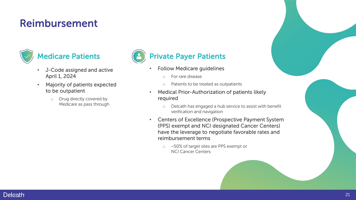 Reimbursement Medicare Patients Private Payer Patients • Follow Medicare guidelines • J-Code assigned and active April 1, 2024 o For rare disease o Patients to be treated as outpatients • Majority of patients expected to be outpatient • Medical Prior-Authorization of patients likely required o Drug directly covered by Medicare as pass through o Delcath has engaged a hub service to assist with benefit verification and navigation • Centers of Excellence (Prospective Payment System (PPS) exempt and NCI designated Cancer Centers) have the leverage to negotiate favorable rates and reimbursement terms o ~50% of target sites are PPS exempt or NCI Cancer Centers 21