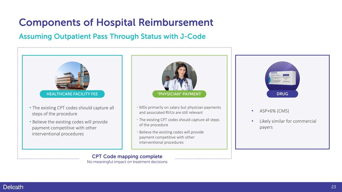 Components of Hospital Reimbursement Assuming Outpatient Pass Through Status with J-Code HEALTHCARE FACILITY FEE “PHYSICIAN” PAYMENT DRUG • MDs primarily on salary but physician payments • The existing CPT codes should capture all • ASP+6% (CMS) and associated RVUs are still relevant steps of the procedure • The existing CPT codes should capture all steps • Likely similar for commercial • Believe the existing codes will provide of the procedure payers payment competitive with other • Believe the existing codes will provide interventional procedures payment competitive with other interventional procedures CPT Code mapping complete No meaningful impact on treatment decisions 23