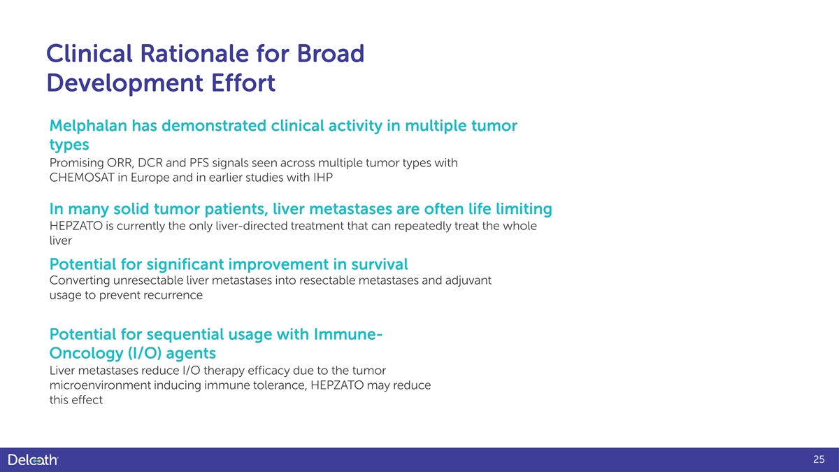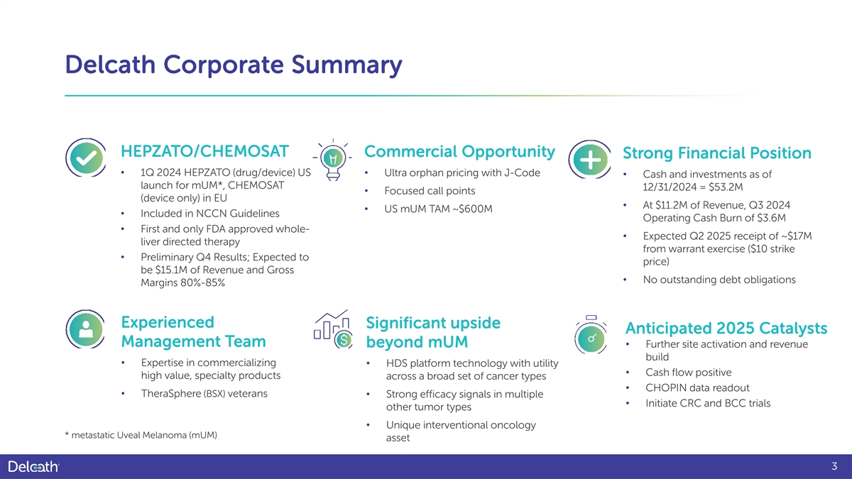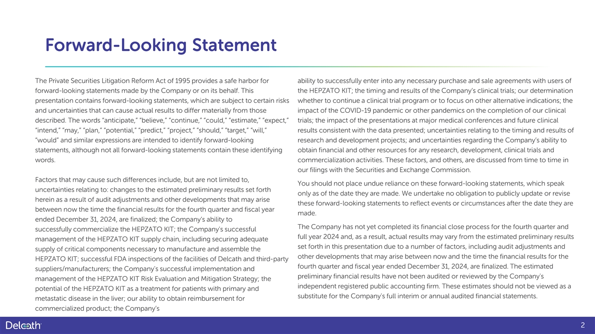 Forward-Looking Statement The Private Securities Litigation Reform Act of 1995 provides a safe harbor for ability to successfully enter into any necessary purchase and sale agreements with users of forward-looking statements made by the Company or on its behalf. This the HEPZATO KIT; the timing and results of the Company’s clinical trials; our determination presentation contains forward-looking statements, which are subject to certain risks whether to continue a clinical trial program or to focus on other alternative indications; the and uncertainties that can cause actual results to differ materially from those impact of the COVID-19 pandemic or other pandemics on the completion of our clinical described. The words “anticipate,” “believe,” “continue,” “could,” “estimate,” “expect,” trials; the impact of the presentations at major medical conferences and future clinical “intend,” “may,” “plan,” “potential,” “predict,” “project,” “should,” “target,” “will,” results consistent with the data presented; uncertainties relating to the timing and results of “would” and similar expressions are intended to identify forward-looking research and development projects; and uncertainties regarding the Company’s ability to statements, although not all forward-looking statements contain these identifying obtain financial and other resources for any research, development, clinical trials and words. commercialization activities. These factors, and others, are discussed from time to time in our filings with the Securities and Exchange Commission. Factors that may cause such differences include, but are not limited to, You should not place undue reliance on these forward-looking statements, which speak uncertainties relating to: changes to the estimated preliminary results set forth only as of the date they are made. We undertake no obligation to publicly update or revise herein as a result of audit adjustments and other developments that may arise these forward-looking statements to reflect events or circumstances after the date they are between now the time the financial results for the fourth quarter and fiscal year made. ended December 31, 2024, are finalized; the Company’s ability to The Company has not yet completed its financial close process for the fourth quarter and successfully commercialize the HEPZATO KIT; the Company's successful full year 2024 and, as a result, actual results may vary from the estimated preliminary results management of the HEPZATO KIT supply chain, including securing adequate set forth in this presentation due to a number of factors, including audit adjustments and supply of critical components necessary to manufacture and assemble the other developments that may arise between now and the time the financial results for the HEPZATO KIT; successful FDA inspections of the facilities of Delcath and third-party fourth quarter and fiscal year ended December 31, 2024, are finalized. The estimated suppliers/manufacturers; the Company's successful implementation and preliminary financial results have not been audited or reviewed by the Company's management of the HEPZATO KIT Risk Evaluation and Mitigation Strategy; the independent registered public accounting firm. These estimates should not be viewed as a potential of the HEPZATO KIT as a treatment for patients with primary and substitute for the Company's full interim or annual audited financial statements. metastatic disease in the liver; our ability to obtain reimbursement for commercialized product; the Company’s 2