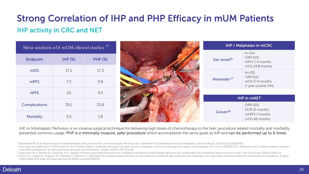 Strong Correlation of IHP and PHP Efficacy in mUM Patients IHP activity in CRC and NET 15 IHP / Melphalan in mCRC Meta-analysis o f 8 mUM clinical studies N=154 ORR 50% 16 Endpoint IHP (%) PHP (%) Van Iersel mPFS 7.4 months mOS 24.8 months mOS 17.1 17.3 N=120 ORR 61% 17 Alexander mOS 17.4 months mPFS 7.2 9.6 2-year survival 34% hPFS 10 9.5 IHP in mNET Complications 39.1 23.8 ORR 50% DOR 15 months 18 Grover mhPFS 7 months Mortality 5.5 1.8 mOS 48 months IHP, or Intrahepatic Perfusion, is an invasive surgical technique for delivering high doses of chemotherapy to the liver; procedure related mortality and morbidity prevented common usage. PHP is a minimally invasive, safer procedure which accomplishes the same goals as IHP and can be performed up to 6 times. 15 Bethlehem MS et al. Meta-Analysis of Isolated Hepatic Perfusion and Percutaneous Hepatic Perfusion as a Treatment for Uveal Melanoma Liver Metastases. Cancers (Basel). 2021 Sep 21;13(18):4726. 16 Van Iersel LB, Gelderblom H, Vahrmeijer AL, et al. Isolated hepatic melphalan perfusion of colorectal liver metastases: outcome and prognostic factors in 154 patients. Ann Oncol. 2008;19:1127–34Grover A et al. Isolated Hepatic Perfusion with 200 mg Melphalan for Advanced Noncolorectal Liver Metastases. Surgery. (2005). 136. 1176-82. 17 Alexander HR Jr, Bartlett DL, Libutti SK, et al. Analysis of factors associated with outcome in patients undergoing isolated hepatic perfusion for unresectable liver metastases from colorectal center. Ann Surg Oncol. 2009;16:1852–9 18 Grover AC, Libutti SK, Pingpank JF, Helsabeck C, Beresnev T, Alexander HR. Isolated hepatic perfusion for the treatment of patients with advanced liver metastases from pancreatic and gastrointestinal neuroendocrine neoplasms. Surgery. 2004;136(6):1176-1182. doi:https://doi.org/10.1016/j.surg.2004.06.044 26