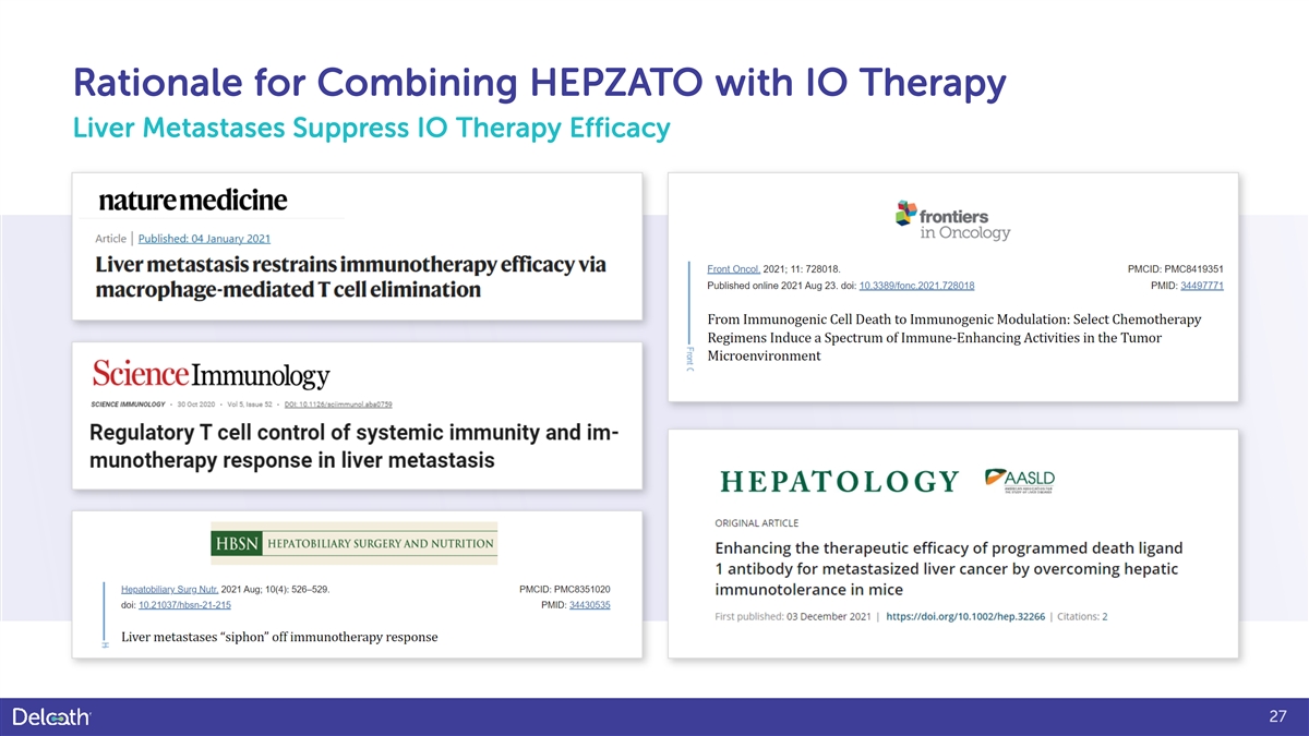 Rationale for Combining HEPZATO with IO Therapy Liver Metastases Suppress IO Therapy Efficacy 27