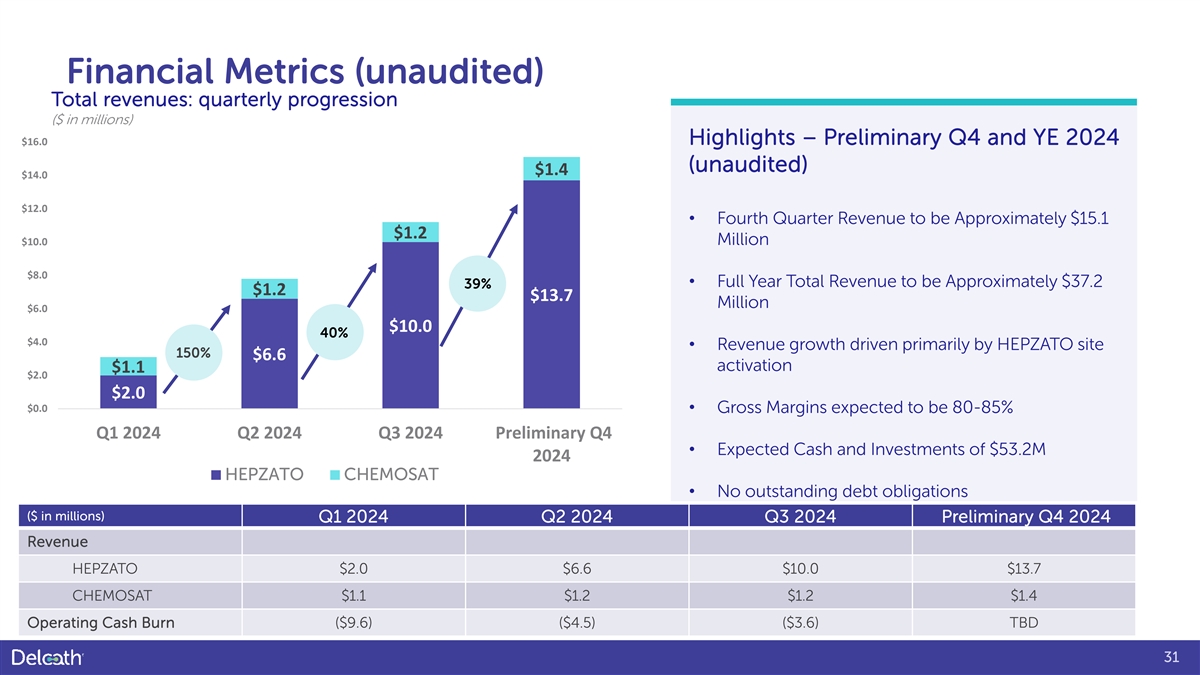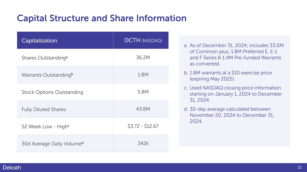 Capital Structure and Share Information DCTH (NASDAQ) Capitalization a. As of December 31, 2024; includes 33.0M of Common plus; 1.8M Preferred E, E-1 a 36.2M and F Series & 1.4M Pre-funded Warrants Shares Outstanding as converted. b. 1.8M warrants at a $10 exercise price b 1.8M Warrants Outstanding (expiring May 2025). c. Used NASDAQ closing price information 5.8M Stock Options Outstanding starting on January 1, 2024 to December 31, 2024. 43.8M d. 30-day average calculated between Fully Diluted Shares November 20, 2024 to December 31, 2024. c $3.72 - $12.67 52 Week Low - High d 342k 30d Average Daily Volume 32
