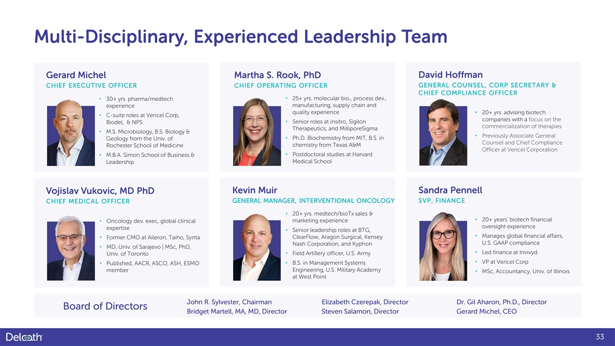 Multi-Disciplinary, Experienced Leadership Team David Hoffman Gerard Michel Martha S. Rook, PhD GENERAL COUNSEL, CORP SECRETARY & CHIEF EXECUTIVE OFFICER CHIEF OPERATING OFFICER CHIEF COMPLIANCE OFFICER • 30+ yrs. pharma/medtech • 25+ yrs. molecular bio., process dev., manufacturing, supply chain and experience quality experience • 20+ yrs. advising biotech • C-suite roles at Vericel Corp, companies with a focus on the • Senior roles at insitro, Sigilon Biodel, & NPS commercialization of therapies Therapeutics, and MilliporeSigma • M.S. Microbiology, B.S. Biology & • Previously Associate General • Ph.D. Biochemistry from MIT, B.S. in Geology from the Univ. of Counsel and Chief Compliance chemistry from Texas A&M Rochester School of Medicine Officer at Vericel Corporation • Postdoctoral studies at Harvard • M.B.A. Simon School of Business & Medical School Leadership Kevin Muir Sandra Pennell Vojislav Vukovic, MD PhD GENERAL MANAGER, INTERVENTIONAL ONCOLOGY SVP, FINANCE CHIEF MEDICAL OFFICER • 20+ yrs. medtech/bioTx sales & • 20+ years' biotech financial marketing experience • Oncology dev. exec, global clinical oversight experience expertise • Senior leadership roles at BTG, • Manages global financial affairs, ClearFlow, Aragon Surgical, Kensey • Former CMO at Aileron, Taiho, Synta U.S. GAAP compliance Nash Corporation, and Kyphon • MD, Univ. of Sarajevo | MSc, PhD, • Led finance at Invivyd • Field Artillery officer, U.S. Army Univ. of Toronto • VP at Vericel Corp • B.S. in Management Systems • Published, AACR, ASCO, ASH, ESMO Engineering, U.S. Military Academy member • MSc, Accountancy, Univ. of Illinois at West Point John R. Sylvester, Chairman Elizabeth Czerepak, Director Dr. Gil Aharon, Ph.D., Director Board of Directors Bridget Martell, MA, MD, Director Steven Salamon, Director Gerard Michel, CEO 33