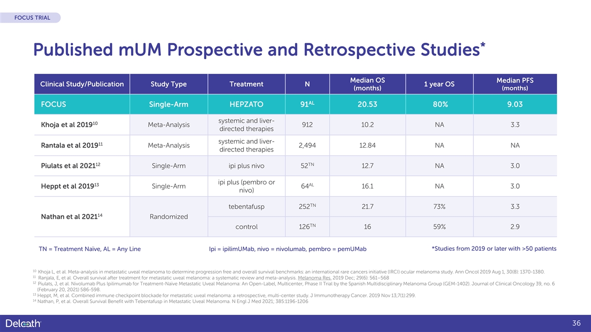 FOCUS TRIAL * Published mUM Prospective and Retrospective Studies Median OS Median PFS Clinical Study/Publication Study Type Treatment N 1 year OS (months) (months) AL FOCUS Single-Arm HEPZATO 91 20.53 80% 9.03 systemic and liver- 10 Khoja et al 2019 Meta-Analysis 912 10.2 NA 3.3 directed therapies systemic and liver- 11 Rantala et al 2019 Meta-Analysis 2,494 12.84 NA NA directed therapies 12 TN Piulats et al 2021 Single-Arm ipi plus nivo 52 12.7 NA 3.0 ipi plus (pembro or 13 AL Heppt et al 2019 Single-Arm 64 16.1 NA 3.0 nivo) TN tebentafusp 252 21.7 73% 3.3 14 Nathan et al 2021 Randomized TN control 126 16 59% 2.9 TN = Treatment Naïve, AL = Any Line Ipi = ipilimUMab, nivo = nivolumab, pembro = pemUMab *Studies from 2019 or later with >50 patients 10 Khoja L, et al. Meta-analysis in metastatic uveal melanoma to determine progression free and overall survival benchmarks: an international rare cancers initiative (IRCI) ocular melanoma study. Ann Oncol 2019 Aug 1, 30(8): 1370-1380. 11 Ranjala, E, et al. Overall survival after treatment for metastatic uveal melanoma: a systematic review and meta-analysis. Melanoma Res. 2019 Dec; 29(6): 561–568 12 Piulats, J, et al. Nivolumab Plus Ipilimumab for Treatment-Naïve Metastatic Uveal Melanoma: An Open-Label, Multicenter, Phase II Trial by the Spanish Multidisciplinary Melanoma Group (GEM-1402). Journal of Clinical Oncology 39, no. 6 (February 20, 2021) 586-598. 13 Heppt, M, et al. Combined immune checkpoint blockade for metastatic uveal melanoma: a retrospective, multi-center study. J Immunotherapy Cancer. 2019 Nov 13;7(1):299. 14 Nathan, P, et al. Overall Survival Benefit with Tebentafusp in Metastatic Uveal Melanoma. N Engl J Med 2021; 385:1196-1206 36