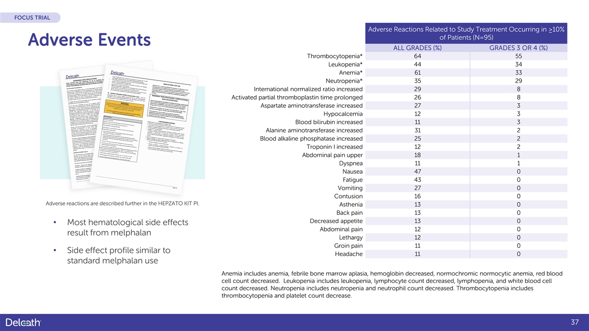 FOCUS TRIAL Adverse Reactions Related to Study Treatment Occurring in ≥10% of Patients (N=95) Adverse Events ALL GRADES (%) GRADES 3 OR 4 (%) Thrombocytopenia* 64 55 Leukopenia* 44 34 Anemia* 61 33 Neutropenia* 35 29 International normalized ratio increased 29 8 Activated partial thromboplastin time prolonged 26 8 Aspartate aminotransferase increased 27 3 Hypocalcemia 12 3 Blood bilirubin increased 11 3 Alanine aminotransferase increased 31 2 Blood alkaline phosphatase increased 25 2 Troponin I increased 12 2 Abdominal pain upper 18 1 Dyspnea 11 1 Nausea 47 0 Fatigue 43 0 Vomiting 27 0 Contusion 16 0 Adverse reactions are described further in the HEPZATO KIT PI. Asthenia 13 0 Back pain 13 0 Decreased appetite 13 0 • Most hematological side effects Abdominal pain 12 0 result from melphalan Lethargy 12 0 Groin pain 11 0 • Side effect profile similar to Headache 11 0 standard melphalan use Anemia includes anemia, febrile bone marrow aplasia, hemoglobin decreased, normochromic normocytic anemia, red blood cell count decreased. Leukopenia includes leukopenia, lymphocyte count decreased, lymphopenia, and white blood cell count decreased. Neutropenia includes neutropenia and neutrophil count decreased. Thrombocytopenia includes thrombocytopenia and platelet count decrease. 37