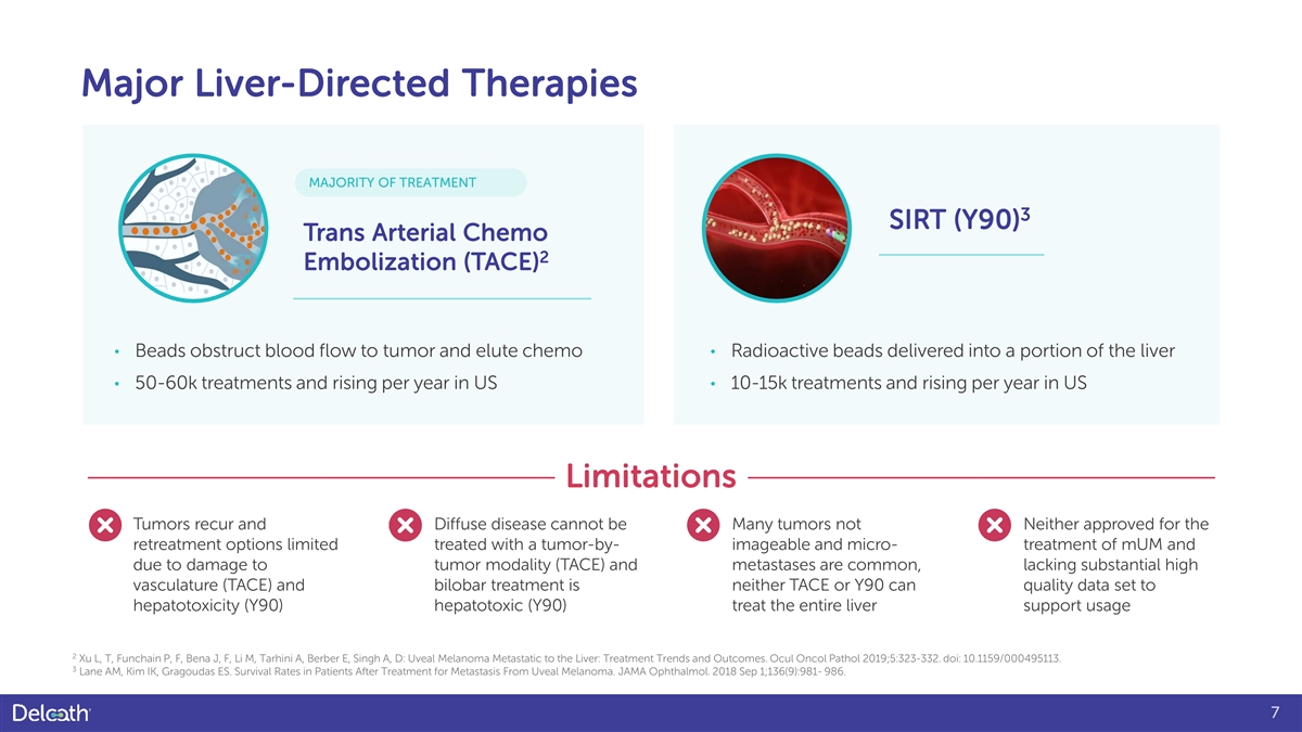 Diffuse Disease and Whole Liver Treatment Liver metastases in mUM and other Cancers are Often Multi-focal • Solitary liver lesions are often treated with surgery or ablation. • Radiographically, metastatic disease can initially present only as focal lesions. • Micrometastases are difficult to detect – recurrence is common • Traditional liver-directed therapy mechanism of action is not optimal if a whole liver treatment is needed. • Whole organ therapy delivers medication to a specific organ Actual mUM patient sent for a liver resection based upon radiographic diagnosis* then filters out the medication to minimize systemic exposure. * Data on File . 6