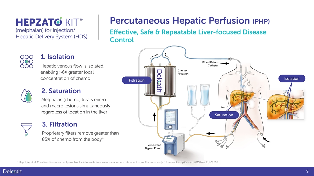 References 1. Reddy S, et al. Isolated hepatic perfusion for patients with liver metastases, Ther Adv Med Oncol. 2014 Jul; 6(4): 180-194. 2. Xu L, T, Funchain P, F, Bena J, F, Li M, Tarhini A, Berber E, Singh A, D: Uveal Melanoma Metastatic to the Liver: Treatment Trends and Outcomes. Ocul Oncol Pathol 2019;5:323-332. doi: 10.1159/000495113. 3. Lane AM, Kim IK, Gragoudas ES. Survival Rates in Patients After Treatment for Metastasis From Uveal Melanoma. JAMA Ophthalmol. 2018 Sep 1;136(9):981- 986. 4. Heppt, M, et al. Combined immune checkpoint blockade for metastatic uveal melanoma: a retrospective, multi-center study. J Immunotherap Cancer. 2019 Nov 13;7(1):299. 5. Krantz BA, et al. Uveal Melanoma: Epidemiology, Etiology, and Treatment of Primary Disease. Clin Ophthalmol. 2017;11:279-289 6. Eschelman DJ et al. Transhepatic Therapies for Metastatic Uveal Melanoma. Semin Intervent Radiol. 2013;30(1):39-48. 7. Carvajal RD, et al. Metastatic Disease from Uveal Melanoma: Treatment Options and Future Prospects. Br J Ophthalmol. 2017;101(1):38-44. 8. Olofsson BR, et al. Isolated Hepatic Perfusion With Melphalan for Patients With Isolated Uveal Melanoma Liver Metastases: A Multicenter, Randomized, Open-Label, Phase III Trial (the SCANDIUM Trial). J Clin Oncol. 2023 Jun 1;41(16):3042-3050. 9. DOI: 10.1200/JCO.2022.40.16_suppl.9510 Journal of Clinical Oncology 40, no. 16_suppl (June 01, 2022) 9510-9510. 10. Khoja L, et al. Meta-analysis in metastatic uveal melanoma to determine progression free and overall survival benchmarks: an international rare cancers initiative (IRCI) ocular melanoma study. Ann Oncol 2019 Aug 1, 30(8): 1370-1380. 11. Ranjala, E, et al. Overall survival after treatment for metastatic uveal melanoma: a systematic review and meta-analysis. Melanoma Res. 2019 Dec; 29(6): 561–568 12. Piulats, J, et al. Nivolumab Plus Ipilimumab for Treatment-Naïve Metastatic Uveal Melanoma: An Open-Label, Multicenter, Phase II Trial by the Spanish Multidisciplinary Melanoma Group (GEM-1402). Journal of Clinical Oncology 39, no. 6 (February 20, 2021) 586-598. 13. Heppt, M, et al. Combined immune checkpoint blockade for metastatic uveal melanoma: a retrospective, multi-center study. J Immunotherapy Cancer. 2019 Nov 13;7(1):299. 14. Nathan, P, et al. Overall Survival Benefit with Tebentafusp in Metastatic Uveal Melanoma. N Engl J Med 2021; 385:1196-1206 15. Bethlehem MS et al. Meta-Analysis of Isolated Hepatic Perfusion and Percutaneous Hepatic Perfusion as a Treatment for Uveal Melanoma Liver Metastases. Cancers (Basel). 2021 Sep 21;13(18):4726. 16. Van Iersel LB, Gelderblom H, Vahrmeijer AL, et al. Isolated hepatic melphalan perfusion of colorectal liver metastases: outcome and prognostic factors in 154 patients. Ann Oncol. 2008;19:1127–34Grover A et al. Isolated Hepatic Perfusion with 200 mg Melphalan for Advanced Noncolorectal Liver Metastases. Surgery. (2005). 136. 1176-82. 17. Alexander HR Jr, Bartlett DL, Libutti SK, et al. Analysis of factors associated with outcome in patients undergoing isolated hepatic perfusion for unresectable liver metastases from colorectal center. Ann Surg Oncol. 2009;16:1852–9. 18. Grover AC, Libutti SK, Pingpank JF, Helsabeck C, Beresnev T, Alexander HR. Isolated hepatic perfusion for the treatment of patients with advanced liver metastases from pancreatic and gastrointestinal neuroendocrine neoplasms. Surgery. 2004;136(6):1176-1182. doi:https://doi.org/10.1016/j.surg.2004.06.044 19. Tong TML et al. Combining Melphalan Percutaneous Hepatic Perfusion with Ipilimumab Plus Nivolumab in Advanced Uveal Melanoma: First Safety and Efficacy Data from the Phase Ib Part of the Chopin Trial. Cardiovasc Intervent Radiol. 2023 Mar;46(3):350-359. 39