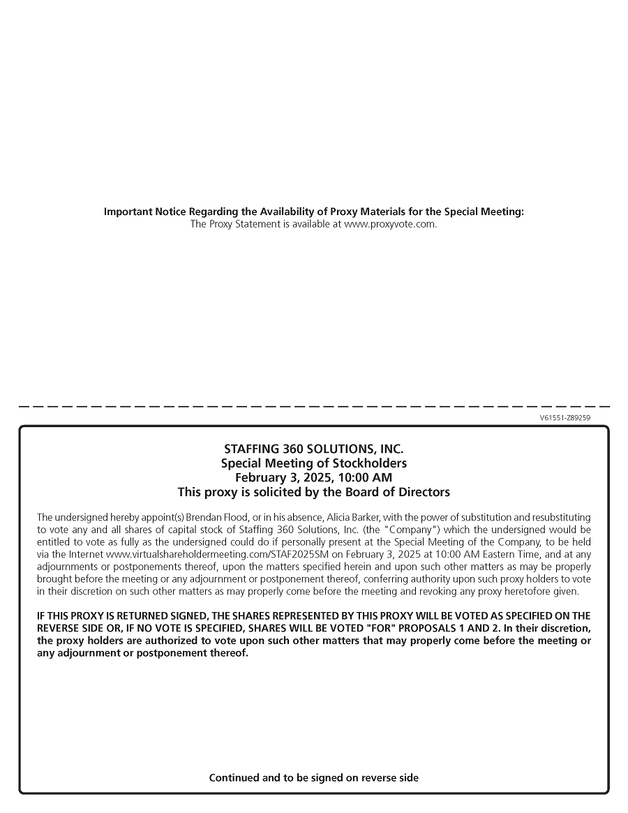 NOTICE IS HEREBY GIVEN that Staffing 360 Solutions, Inc. (“Staffing 360”) will hold a completely virtual special meeting of its stockholders (the “Special Meeting”) at the Special Meeting’s website, at www.virtualshareholdermeeting.com/STAF2025SM, on February 3, 2025, beginning at 10:00, Eastern Time, for the purpose of considering and voting on the following proposals: