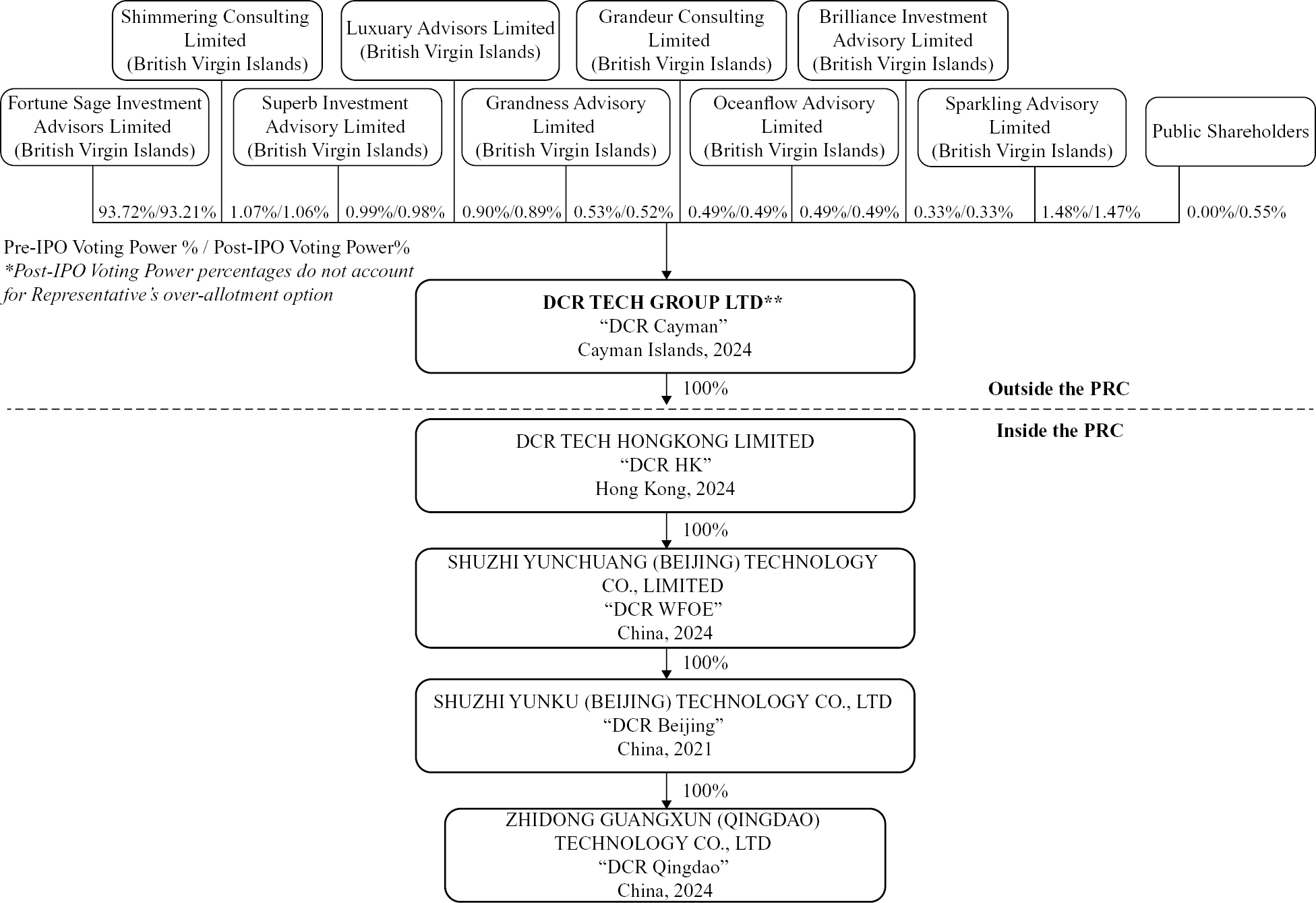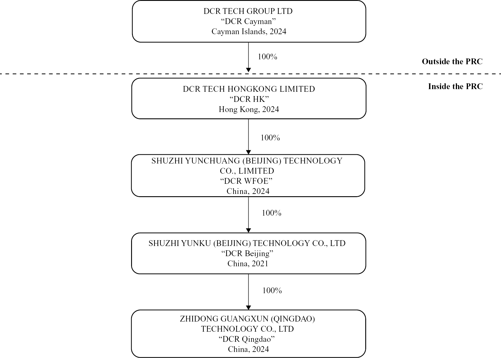 Unless otherwise stated, as used in this prospectus, the terms “DCR Cayman,” “we,” “us,” “our Company,” and the “Company” refer to DCR Tech Group Ltd, an exempted company with limited liability incorporated under the laws of the Cayman Islands; the terms the “PRC subsidiary” and the “operating subsidiary” refer to Shuzhi Yunku (Beijing) Technology Co., Ltd., or DCR Beijing, an entity organized under the laws of the PRC; the term “PRC subsidiaries” refers to DCR Beijing and its subsidiary, namely Zhidong Guangxun (Qingdao) Technology Co., Ltd, or DCR Qingdao.