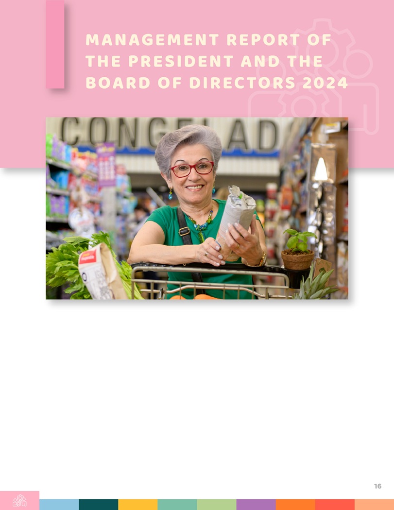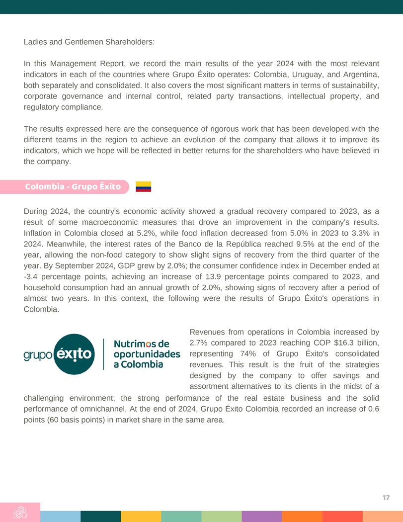 Ladies and Gentlemen Shareholders : In this Management Report, we record the main results of the year 2024 with the most relevant indicators in each of the countries where Grupo Éxito operates : Colombia, Uruguay, and Argentina, both separately and consolidated . It also covers the most significant matters in terms of sustainability, corporate governance and internal control, related party transactions, intellectual property, and regulatory compliance . The results expressed here are the consequence of rigorous work that has been developed with the different teams in the region to achieve an evolution of the company that allows it to improve its indicators, which we hope will be reflected in better returns for the shareholders who have believed in the company . Colombia - Grupo É \ ito During 2024 , the country’s economic activity showed a gradual recovery compared to 2023 , as a result of some macroeconomic measures that drove an improvement in the company’s results . Inflation in Colombia closed at 5 . 2 % , while food inflation decreased from 5 . 0 % in 2023 to 3 . 3 % in 2024 . Meanwhile, the interest rates of the Banco de la República reached 9 . 5 % at the end of the year, allowing the non - food category to show slight signs of recovery from the third quarter of the year . By September 2024 , GDP grew by 2 . 0 % ; the consumer confidence index in December ended at - 3 . 4 percentage points, achieving an increase of 13 . 9 percentage points compared to 2023 , and household consumption had an annual growth of 2 . 0 % , showing signs of recovery after a period of almost two years . In this context, the following were the results of Grupo Éxito’s operations in Colombia . Revenues from operations in Colombia increased by 2 . 7 % compared to 2023 reaching COP $ 16 . 3 billion, representing 74 % of Grupo Éxito’s consolidated revenues . This result is the fruit of the strategies designed by the company to offer savings and assortment alternatives to its clients in the midst of a challenging environment ; the strong performance of the real estate business and the solid performance of omnichannel . At the end of 2024 , Grupo Éxito Colombia recorded an increase of 0 . 6 points ( 60 basis points) in market share in the same area . 17