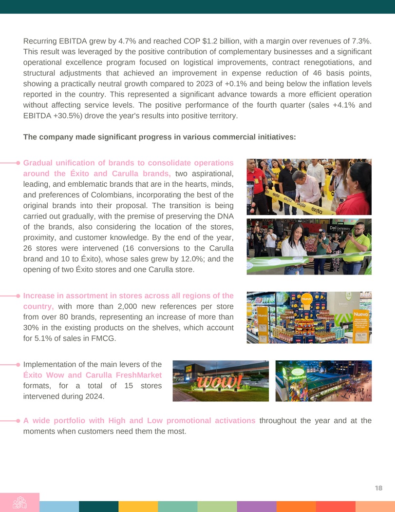 Recurring EBITDA grew by 4 . 7 % and reached COP $ 1 . 2 billion, with a margin over revenues of 7 . 3 % . This result was leveraged by the positive contribution of complementary businesses and a significant operational excellence program focused on logistical improvements, contract renegotiations, and structural adjustments that achieved an improvement in expense reduction of 46 basis points, showing a practically neutral growth compared to 2023 of + 0 . 1 % and being below the inflation levels reported in the country . This represented a significant advance towards a more efficient operation without affecting service levels . The positive performance of the fourth quarter (sales + 4 . 1 % and EBITDA + 30 . 5 % ) drove the year’s results into positive territory . The company made significant progress in various commercial initiatives : Gradual unification of brands to consolidate operations around the Éxito and Carulla brands, two aspirational, leading, and emblematic brands that are in the hearts, minds, and preferences of Colombians, incorporating the best of the original brands into their proposal . The transition is being carried out gradually, with the premise of preserving the DNA of the brands, also considering the location of the stores, proximity, and customer knowledge . By the end of the year, 26 stores were intervened ( 16 conversions to the Carulla brand and 10 to Éxito), whose sales grew by 12 . 0 % ; and the opening of two Éxito stores and one Carulla store . Increase in assortment in stores across all regions of the country, with more than 2 , 000 new references per store from over 80 brands, representing an increase of more than 30 % in the existing products on the shelves, which account for 5 . 1 % of sales in FMCG . Implementation of the main levers of the Éxito Wow and Carulla FreshMarket formats, for a total of 15 stores intervened during 2024 . A wide portfolio with High and Low promotional activations throughout the year and at the moments when customers need them the most . 18