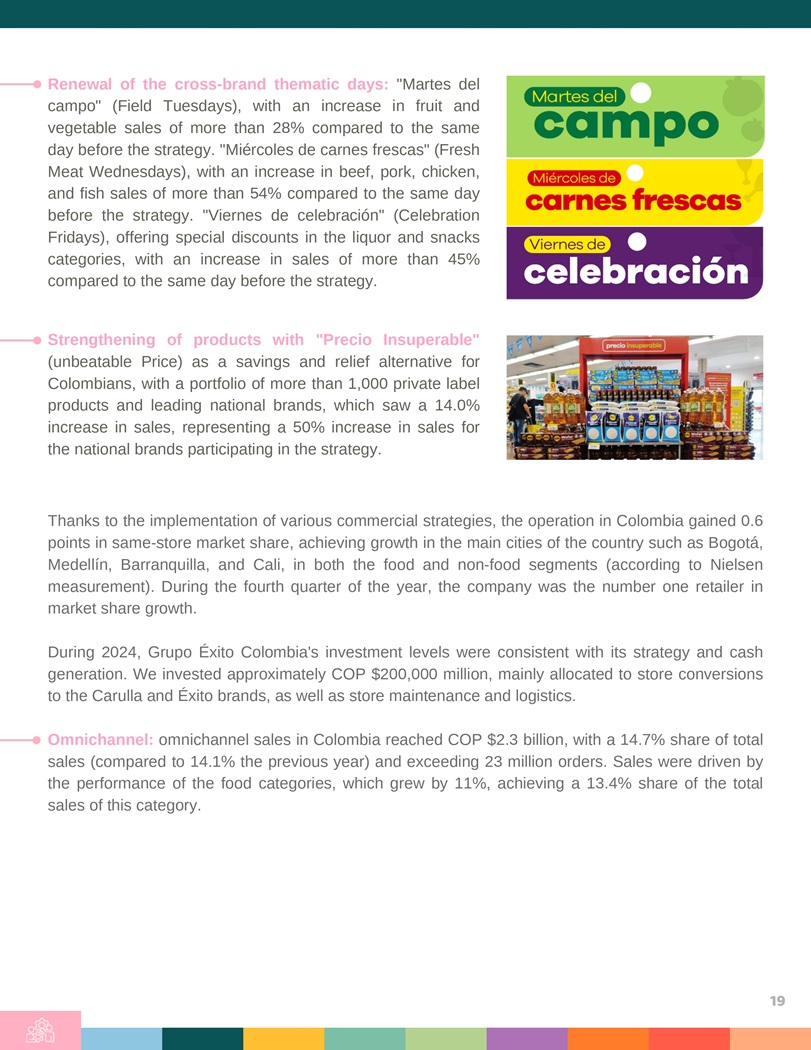 Renewal of the cross - brand thematic days : “Martes del campo” (Field Tuesdays), with an increase in fruit and vegetable sales of more than 28 % compared to the same day before the strategy . “Miércoles de carnes frescas” (Fresh Meat Wednesdays), with an increase in beef, pork, chicken, and fish sales of more than 54 % compared to the same day before the strategy . “Viernes de celebración” (Celebration Fridays), offering special discounts in the liquor and snacks categories, with an increase in sales of more than 45 % compared to the same day before the strategy . Strengthening of products with “Precio Insuperable” (unbeatable Price) as a savings and relief alternative for Colombians, with a portfolio of more than 1 , 000 private label products and leading national brands, which saw a 14 . 0 % increase in sales, representing a 50 % increase in sales for the national brands participating in the strategy . Thanks to the implementation of various commercial strategies, the operation in Colombia gained 0 . 6 points in same - store market share, achieving growth in the main cities of the country such as Bogotá, Medellín, Barranquilla, and Cali, in both the food and non - food segments (according to Nielsen measurement) . During the fourth quarter of the year, the company was the number one retailer in market share growth . During 2024 , Grupo Éxito Colombia’s investment levels were consistent with its strategy and cash generation . We invested approximately COP $ 200 , 000 million, mainly allocated to store conversions to the Carulla and Éxito brands, as well as store maintenance and logistics . Omnichannel : omnichannel sales in Colombia reached COP $ 2 . 3 billion, with a 14 . 7 % share of total sales (compared to 14 . 1 % the previous year) and exceeding 23 million orders . Sales were driven by the performance of the food categories, which grew by 11 % , achieving a 13 . 4 % share of the total sales of this category . 19