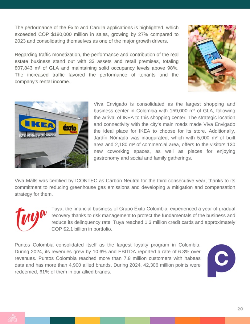 The performance of the Éxito and Carulla applications is highlighted, which exceeded COP $ 180 , 000 million in sales, growing by 27 % compared to 2023 and consolidating themselves as one of the major growth drivers . Regarding traffic monetization, the performance and contribution of the real estate business stand out with 33 assets and retail premises, totaling 807 , 843 m² of GLA and maintaining solid occupancy levels above 98 % . The increased traffic favored the performance of tenants and the company’s rental income . Viva Malls was certified by ICONTEC as Carbon Neutral for the third consecutive year, thanks to its commitment to reducing greenhouse gas emissions and developing a mitigation and compensation strategy for them . Tuya, the financial business of Grupo Éxito Colombia, experienced a year of gradual recovery thanks to risk management to protect the fundamentals of the business and reduce its delinquency rate . Tuya reached 1 . 3 million credit cards and approximately COP $ 2 . 1 billion in portfolio . Puntos Colombia consolidated itself as the largest loyalty program in Colombia . During 2024 , its revenues grew by 10 . 6 % and EBITDA reported a rate of 6 . 3 % over revenues . Puntos Colombia reached more than 7 . 8 million customers with habeas data and has more than 4 , 900 allied brands . During 2024 , 42 , 306 million points were redeemed, 61 % of them in our allied brands . Viva Envigado is consolidated as the largest shopping and business center in Colombia with 159 , 000 m² of GLA, following the arrival of IKEA to this shopping center . The strategic location and connectivity with the city’s main roads made Viva Envigado the ideal place for IKEA to choose for its store . Additionally, Jardín Nómada was inaugurated, which with 5 , 000 m² of built area and 2 , 180 m² of commercial area, offers to the visitors 130 new coworking spaces, as well as places for enjoying gastronomy and social and family gatherings . 20