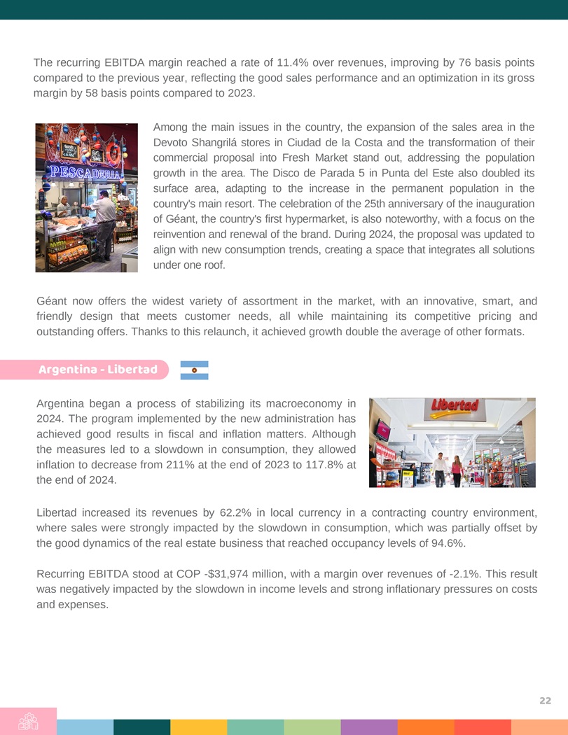 The recurring EBITDA margin reached a rate of 11 . 4 % over revenues, improving by 76 basis points compared to the previous year, reflecting the good sales performance and an optimization in its gross margin by 58 basis points compared to 2023 . Among the main issues in the country, the expansion of the sales area in the Devoto Shangrilá stores in Ciudad de la Costa and the transformation of their commercial proposal into Fresh Market stand out, addressing the population growth in the area . The Disco de Parada 5 in Punta del Este also doubled its surface area, adapting to the increase in the permanent population in the country’s main resort . The celebration of the 25 th anniversary of the inauguration of Géant, the country’s first hypermarket, is also noteworthy, with a focus on the reinvention and renewal of the brand . During 2024 , the proposal was updated to align with new consumption trends, creating a space that integrates all solutions under one roof . Géant now offers the widest variety of assortment in the market, with an innovative, smart, and friendly design that meets customer needs, all while maintaining its competitive pricing and outstanding offers . Thanks to this relaunch, it achieved growth double the average of other formats . Argentina - Libertad Argentina began a process of stabilizing its macroeconomy in 2024 . The program implemented by the new administration has achieved good results in fiscal and inflation matters . Although the measures led to a slowdown in consumption, they allowed inflation to decrease from 211 % at the end of 2023 to 117 . 8 % at the end of 2024 . Libertad increased its revenues by 62 . 2 % in local currency in a contracting country environment, where sales were strongly impacted by the slowdown in consumption, which was partially offset by the good dynamics of the real estate business that reached occupancy levels of 94 . 6 % . Recurring EBITDA stood at COP - $ 31 , 974 million, with a margin over revenues of - 2 . 1 % . This result was negatively impacted by the slowdown in income levels and strong inflationary pressures on costs and expenses . 22