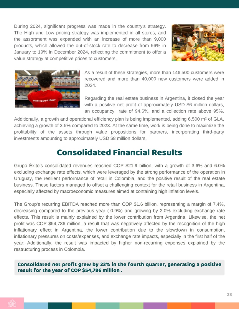 During 2024 , significant progress was made in the country’s strategy . The High and Low pricing strategy was implemented in all stores, and the assortment was expanded with an increase of more than 9 , 000 products, which allowed the out - of - stock rate to decrease from 56 % in January to 19 % in December 2024 , reflecting the commitment to offer a value strategy at competitive prices to customers . As a result of these strategies, more than 146 , 500 customers were recovered and more than 40 , 000 new customers were added in 2024 . Regarding the real estate business in Argentina, it closed the year with a positive net profit of approximately USD $ 6 million dollars, an occupancy rate of 94 . 6 % , and a collection rate above 95 % . Additionally, a growth and operational efficiency plan is being implemented, adding 6 , 500 m² of GLA, achieving a growth of 3 . 5 % compared to 2023 . At the same time, work is being done to maximize the profitability of the assets through value propositions for partners, incorporating third - party investments amounting to approximately USD $ 8 million dollars . Consolidated Financial Results Grupo Éxito’s consolidated revenues reached COP $ 21 . 9 billion, with a growth of 3 . 6 % and 6 . 0 % excluding exchange rate effects, which were leveraged by the strong performance of the operation in Uruguay, the resilient performance of retail in Colombia, and the positive result of the real estate business . These factors managed to offset a challenging context for the retail business in Argentina, especially affected by macroeconomic measures aimed at containing high inflation levels . The Group’s recurring EBITDA reached more than COP $ 1 . 6 billion, representing a margin of 7 . 4 % , decreasing compared to the previous year ( - 0 . 9 % ) and growing by 2 . 0 % excluding exchange rate effects . This result is mainly explained by the lower contribution from Argentina . Likewise, the net profit was COP $ 54 , 786 million, a result that was negatively affected by the recognition of the high inflationary effect in Argentina, the lower contribution due to the slowdown in consumption, inflationary pressures on costs/expenses, and exchange rate impacts, especially in the first half of the year ; Additionally, the result was impacted by higher non - recurring expenses explained by the restructuring process in Colombia . Consolidated net profit grew by 23% in the fourth quarter, generating a positive result for the year of COP $54,786 million . 23