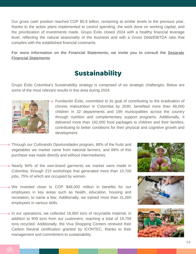 Our gross cash position reached COP $ 0 . 9 billion, remaining at similar levels to the previous year, thanks to the action plans implemented to control spending, the work done on working capital, and the prioritization of investments made . Grupo Éxito closed 2024 with a healthy financial leverage level, reflecting the natural seasonality of the business and with a Gross Debt/EBITDA ratio that complies with the established financial covenants . For more information on the Financial Statements, we invite you to consult the Separate Financial Statements Sustainability Grupo Éxito Colombia’s Sustainability strategy is composed of six strategic challenges . Below are some of the most relevant results in this area during 2024 : Fundación Éxito, committed to its goal of contributing to the eradication of chronic malnutrition in Colombia by 2030 , benefited more than 68 , 000 children in 32 departments and 199 municipalities across the country through nutrition and complementary support programs . Additionally, it delivered more than 182 , 000 food packages to children and their families, contributing to better conditions for their physical and cognitive growth and development . Through our Cultivando Oportunidades program, 88 % of the fruits and vegetables we market came from national farmers, and 88 % of this purchase was made directly and without intermediaries . Nearly 94 % of the own - brand garments we market were made in Colombia, through 215 workshops that generated more than 10 , 700 jobs, 75 % of which are occupied by women . We invested close to COP $ 48 , 000 million in benefits for our employees in key areas such as health, education, housing and recreation, to name a few . Additionally, we trained more than 31 , 000 employees in various skills . In our operations, we collected 18 , 850 tons of recyclable material, in addition to 909 tons from our customers, reaching a total of 19 , 759 tons recycled . Additionally, the Viva Shopping Centers renewed their Carbon Neutral certification granted by ICONTEC, thanks to their management and commitment to sustainability . 24
