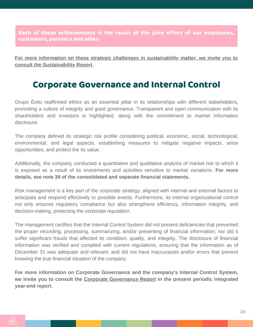 Each of these achievements is the result of the joint effort of our employees, customers, partners and allies. For more information on these strategic challenges in sustainabilit y matter , we invite you to consult the Sustainabilit y Report Corporate Governance and Internal Control Grupo Éxito reaffirmed ethics as an essential pillar in its relationships with different stakeholders, promoting a culture of integrity and good governance . Transparent and open communication with its shareholders and investors is highlighted, along with the commitment to market information disclosure . The company defined its strategic risk profile considering political, economic, social, technological, environmental, and legal aspects, establishing measures to mitigate negative impacts, seize opportunities, and protect the its value . Additionally, the company conducted a quantitative and qualitative analysis of market risk to which it is exposed as a result of its investments and activities sensitive to market variations . For more details, see note 39 of the consolidated and separate financial statements . Risk management is a key part of the corporate strategy, aligned with internal and external factors to anticipate and respond effectively to possible events . Furthermore, its internal organizational control not only ensures regulatory compliance but also strengthens efficiency, information integrity, and decision - making, protecting the corporate reputation . The management certifies that the Internal Control System did not present deficiencies that prevented the proper recording, processing, summarizing, and/or presenting of financial information ; nor did it suffer significant frauds that affected its condition, quality, and integrity . The disclosure of financial information was verified and complied with current regulations, ensuring that the information as of December 31 was adequate and relevant, and did not have inaccuracies and/or errors that prevent knowing the true financial situation of the company . For more information on Corporate Governance and the company’s Internal Control System, we invite you to consult the Corporate Governance Report in the present periodic integrated year - end report . 25