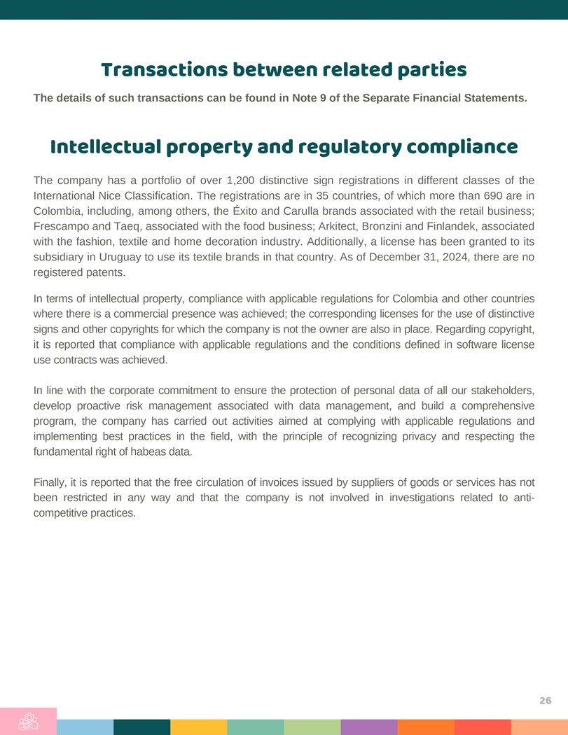 Transactions between related parties The details of such transactions can be found in Note 9 of the Separate Financial Statements . Intellectual property and regulatory compliance The company has a portfolio of over 1 , 200 distinctive sign registrations in different classes of the International Nice Classification . The registrations are in 35 countries, of which more than 690 are in Colombia, including, among others, the Éxito and Carulla brands associated with the retail business ; Frescampo and Taeq, associated with the food business ; Arkitect, Bronzini and Finlandek, associated with the fashion, textile and home decoration industry . Additionally, a license has been granted to its subsidiary in Uruguay to use its textile brands in that country . As of December 31 , 2024 , there are no registered patents . In terms of intellectual property, compliance with applicable regulations for Colombia and other countries where there is a commercial presence was achieved ; the corresponding licenses for the use of distinctive signs and other copyrights for which the company is not the owner are also in place . Regarding copyright, it is reported that compliance with applicable regulations and the conditions defined in software license use contracts was achieved . In line with the corporate commitment to ensure the protection of personal data of all our stakeholders, develop proactive risk management associated with data management, and build a comprehensive program, the company has carried out activities aimed at complying with applicable regulations and implementing best practices in the field, with the principle of recognizing privacy and respecting the fundamental right of habeas data . Finally, it is reported that the free circulation of invoices issued by suppliers of goods or services has not been restricted in any way and that the company is not involved in investigations related to anti - competitive practices . 26