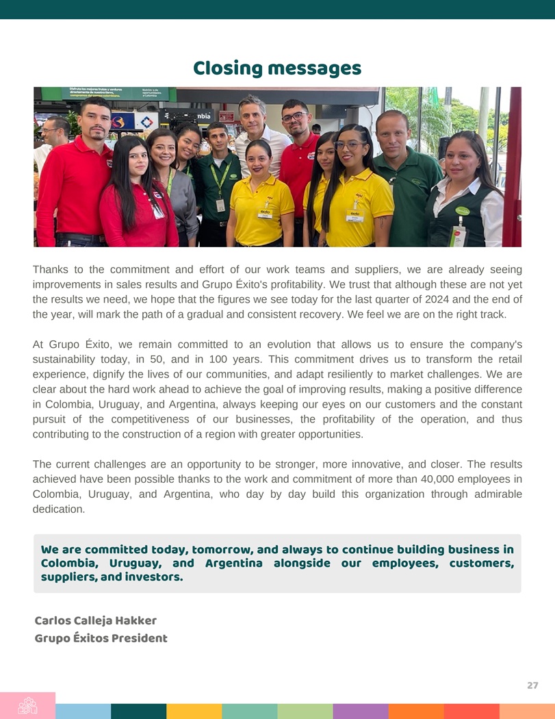 Closing messages Thanks to the commitment and effort of our work teams and suppliers, we are already seeing improvements in sales results and Grupo Éxito’s profitability . We trust that although these are not yet the results we need, we hope that the figures we see today for the last quarter of 2024 and the end of the year, will mark the path of a gradual and consistent recovery . We feel we are on the right track . At Grupo Éxito, we remain committed to an evolution that allows us to ensure the company’s sustainability today, in 50 , and in 100 years . This commitment drives us to transform the retail experience, dignify the lives of our communities, and adapt resiliently to market challenges . We are clear about the hard work ahead to achieve the goal of improving results, making a positive difference in Colombia, Uruguay, and Argentina, always keeping our eyes on our customers and the constant pursuit of the competitiveness of our businesses, the profitability of the operation, and thus contributing to the construction of a region with greater opportunities . The current challenges are an opportunity to be stronger, more innovative, and closer . The results achieved have been possible thanks to the work and commitment of more than 40 , 000 employees in Colombia, Uruguay, and Argentina, who day by day build this organization through admirable dedication . We are committed today, tomorrow, and always to continue building business in Colombia, Uruguay, and Argentina alongside our employees, customers, suppliers, and investors . Carlos Calleja Hakker Grupo É \ itos President 27