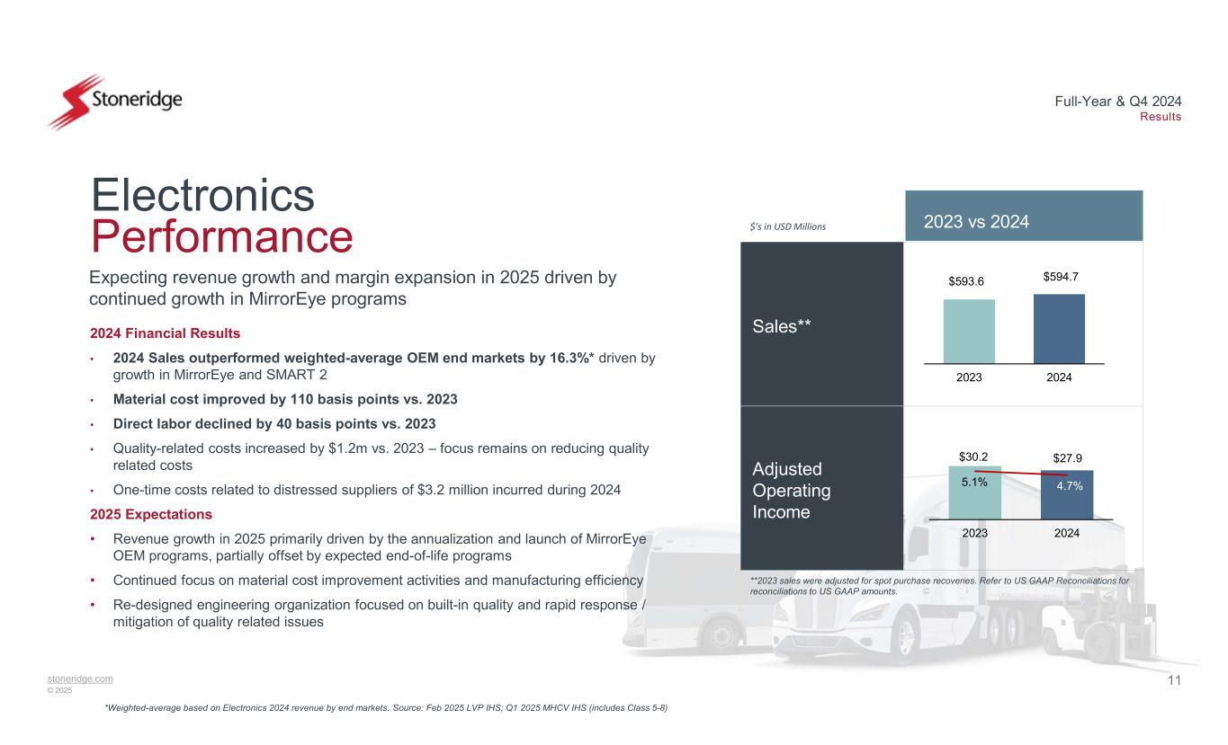 10stoneridge.com © 2025 Full-Year & Q4 2024 Results Sales Adjusted Operating Income Control Devices Performance 2023 vs 2024 2024 Financial Results • Full-year sales declined by ~(14)% vs. 2023 primarily due to lower production volumes for our North American passenger vehicle customers as well as the impact end-of-life programs • Largest impact coming from “Domestic 3” customers which declined (4.3)% year-over-year, outpacing North American end market decline • Material cost improved by 250 basis points vs. 2023 • Quality related costs declined by $2.1 million vs. 2023 2025 Expectations • Expecting sales to decline in 2025, however less than 2024, driven primarily by lower production volume expectations and end-of-life programs • Focus remains on material cost reduction and improved manufacturing performance to drive stable margins despite revenue decline Continued focus on material cost improvements led to 250 bps of operating margin improvement in 2024 $’s in USD Millions $345.3 $296.3 2023 2024 $13.4 $6.6 3.9% 2.2% 2023 2024