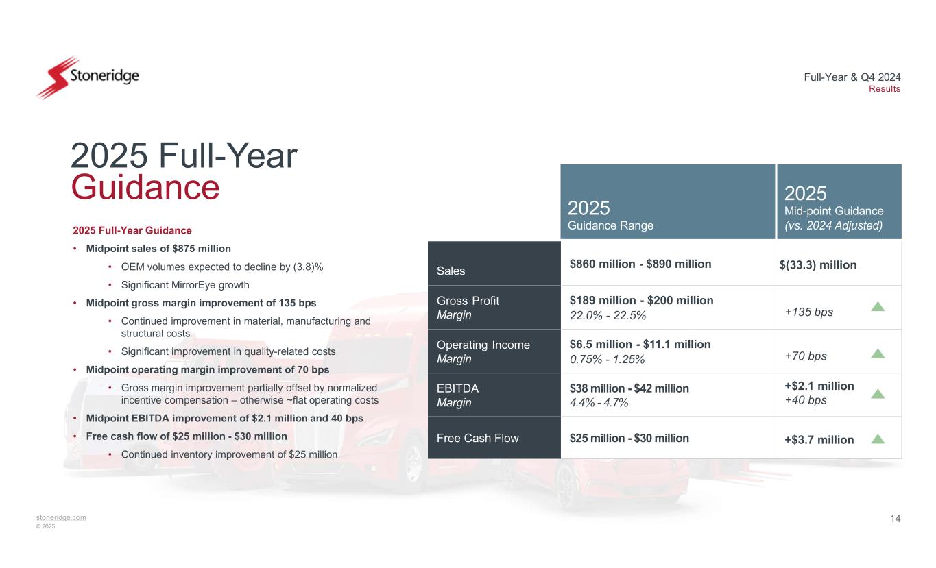 stoneridge.com © 2025 Full-Year & Q4 2024 Results • Outperformed weighted-average OEM end markets by 490 basis points* • MirrorEye revenue increased 22% year-over-year driven by new program launches and the continued ramp-up of previously launched programs • SMART 2 Tachograph grew by ~$27 million over 2023 tachograph sales (~83% growth) • Improvement in material, labor and quality-related costs • Material cost improved by 120 basis points in 2024 • Direct labor improved by 30 bps in 2024 • Focus on working capital management, including inventory reductions, resulted in full- year adjusted free cash flow of $24 million, an improvement of $56 million vs. 2023 • Inventory improved by $36.4 million in 2024, including $25.1 million in Q4 2024 2024 Overview of Achievements Sales $908M ~4.9% outperformance of end markets* Full Year 2024 Results 20.9% of YTD Sales $190M Adjusted EBITDA $38M 4.2% of YTD Sales Free Cash Flow Adjusted Gross Margin $24M $56M Y/Y Improvement *Weighted-average based on 2024 revenue by end markets. Production Data Source: Feb 2025 LVP IHS; Q1 2025 MHCV IHS (includes Class 5-8)