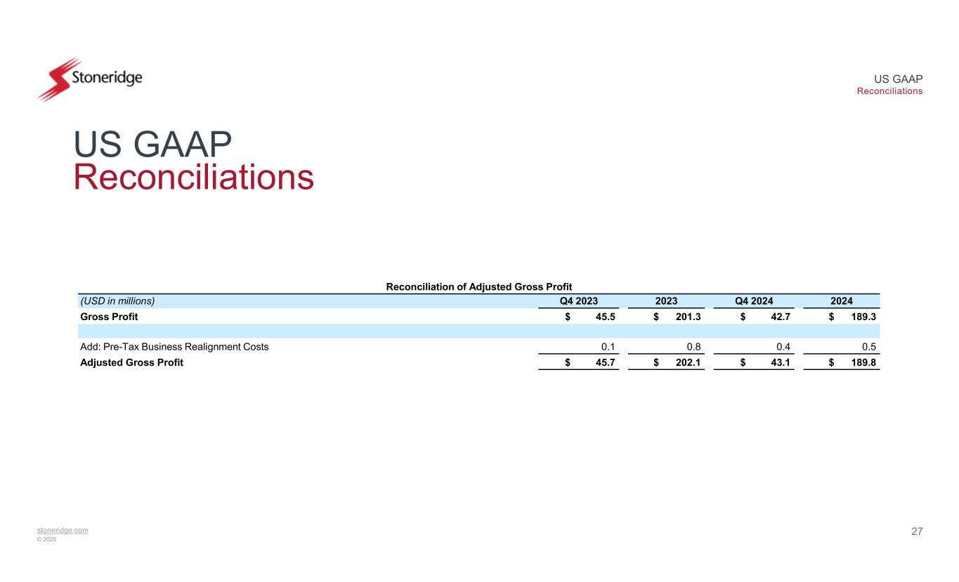 stoneridge.com © 2025 US GAAP Reconciliations 27 US GAAP Reconciliations Reconciliation of Adjusted Gross Profit 2024Q4 20242023Q4 2023(USD in millions) $ 189.3$ 42.7$ 201.3$ 45.5Gross Profit 0.50.40.80.1Add: Pre-Tax Business Realignment Costs $ 189.8$ 43.1$ 202.1$ 45.7Adjusted Gross Profit