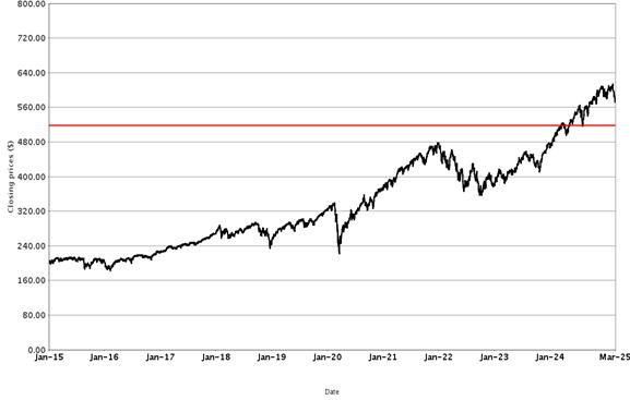 The following graph sets forth historical closing values of the Underlier for the period from January 1, 2015 to March 7, 2025. The red line represents the Coupon Threshold and Buffer Value. We obtained the information in the graph from Bloomberg Financial Markets, without independent investigation. We cannot give you assurance that the performance of the Underlier will result in the return of all of your initial investment.