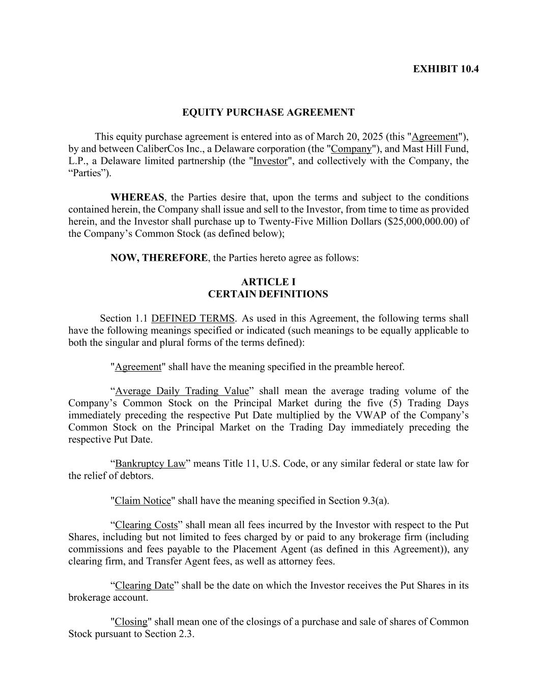 EXHIBIT 10.4 EQUITY PURCHASE AGREEMENT This equity purchase agreement is entered into as of March 20, 2025 (this "Agreement"), by and between CaliberCos Inc., a Delaware corporation (the "Company"), and Mast Hill Fund, L.P., a Delaware limited partnership (the "Investor", and collectively with the Company, the “Parties”). WHEREAS, the Parties desire that, upon the terms and subject to the conditions contained herein, the Company shall issue and sell to the Investor, from time to time as provided herein, and the Investor shall purchase up to Twenty-Five Million Dollars ($25,000,000.00) of the Company’s Common Stock (as defined below); NOW, THEREFORE, the Parties hereto agree as follows: ARTICLE I CERTAIN DEFINITIONS Section 1.1 DEFINED TERMS. As used in this Agreement, the following terms shall have the following meanings specified or indicated (such meanings to be equally applicable to both the singular and plural forms of the terms defined): "Agreement" shall have the meaning specified in the preamble hereof. “Average Daily Trading Value” shall mean the average trading volume of the Company’s Common Stock on the Principal Market during the five (5) Trading Days immediately preceding the respective Put Date multiplied by the VWAP of the Company’s Common Stock on the Principal Market on the Trading Day immediately preceding the respective Put Date. “Bankruptcy Law” means Title 11, U.S. Code, or any similar federal or state law for the relief of debtors. "Claim Notice" shall have the meaning specified in Section 9.3(a). “Clearing Costs” shall mean all fees incurred by the Investor with respect to the Put Shares, including but not limited to fees charged by or paid to any brokerage firm (including commissions and fees payable to the Placement Agent (as defined in this Agreement)), any clearing firm, and Transfer Agent fees, as well as attorney fees. “Clearing Date” shall be the date on which the Investor receives the Put Shares in its brokerage account. "Closing" shall mean one of the closings of a purchase and sale of shares of Common Stock pursuant to Section 2.3.