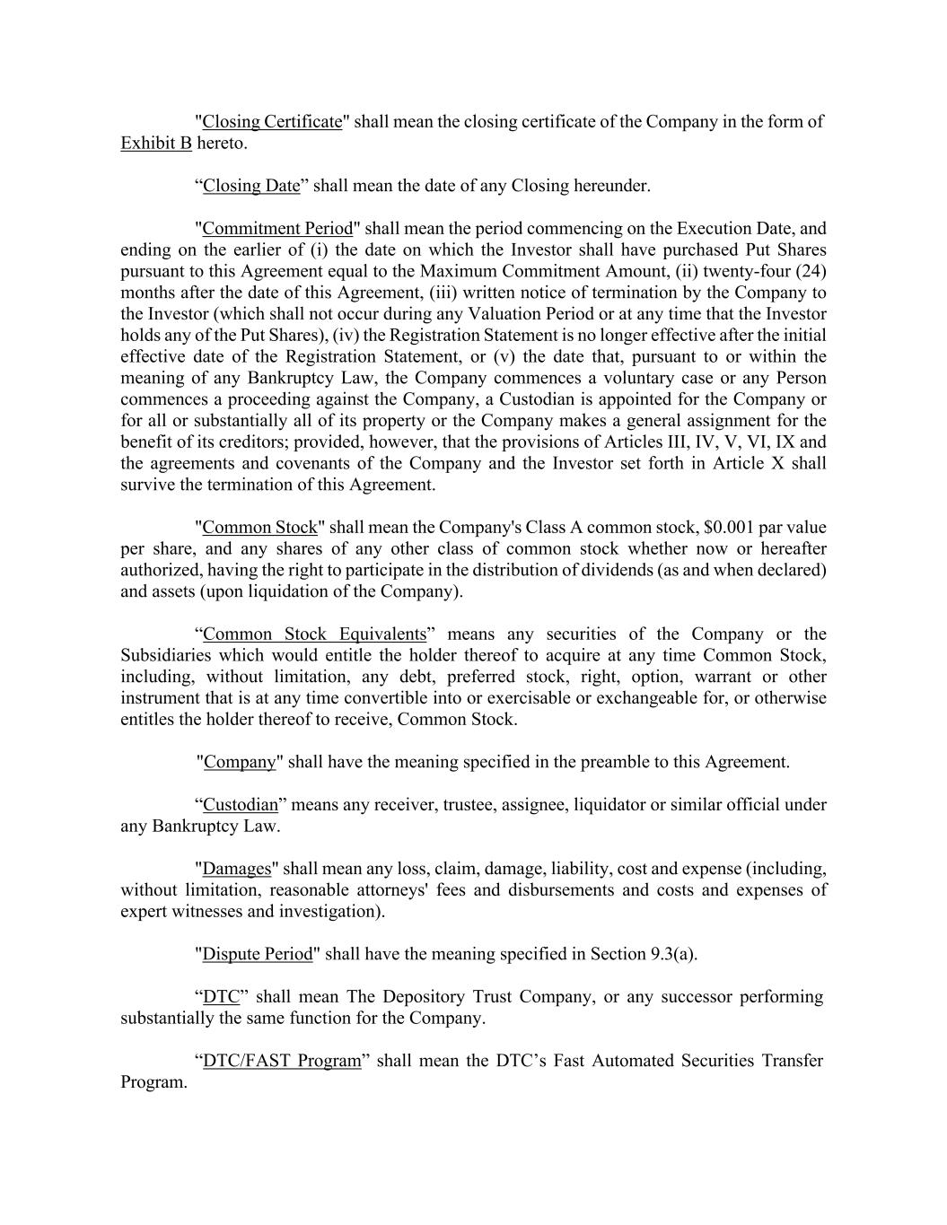 "Closing Certificate" shall mean the closing certificate of the Company in the form of Exhibit B hereto. “Closing Date” shall mean the date of any Closing hereunder. "Commitment Period" shall mean the period commencing on the Execution Date, and ending on the earlier of (i) the date on which the Investor shall have purchased Put Shares pursuant to this Agreement equal to the Maximum Commitment Amount, (ii) twenty-four (24) months after the date of this Agreement, (iii) written notice of termination by the Company to the Investor (which shall not occur during any Valuation Period or at any time that the Investor holds any of the Put Shares), (iv) the Registration Statement is no longer effective after the initial effective date of the Registration Statement, or (v) the date that, pursuant to or within the meaning of any Bankruptcy Law, the Company commences a voluntary case or any Person commences a proceeding against the Company, a Custodian is appointed for the Company or for all or substantially all of its property or the Company makes a general assignment for the benefit of its creditors; provided, however, that the provisions of Articles III, IV, V, VI, IX and the agreements and covenants of the Company and the Investor set forth in Article X shall survive the termination of this Agreement. "Common Stock" shall mean the Company's Class A common stock, $0.001 par value per share, and any shares of any other class of common stock whether now or hereafter authorized, having the right to participate in the distribution of dividends (as and when declared) and assets (upon liquidation of the Company). “Common Stock Equivalents” means any securities of the Company or the Subsidiaries which would entitle the holder thereof to acquire at any time Common Stock, including, without limitation, any debt, preferred stock, right, option, warrant or other instrument that is at any time convertible into or exercisable or exchangeable for, or otherwise entitles the holder thereof to receive, Common Stock. "Company" shall have the meaning specified in the preamble to this Agreement. “Custodian” means any receiver, trustee, assignee, liquidator or similar official under any Bankruptcy Law. "Damages" shall mean any loss, claim, damage, liability, cost and expense (including, without limitation, reasonable attorneys' fees and disbursements and costs and expenses of expert witnesses and investigation). "Dispute Period" shall have the meaning specified in Section 9.3(a). “DTC” shall mean The Depository Trust Company, or any successor performing substantially the same function for the Company. “DTC/FAST Program” shall mean the DTC’s Fast Automated Securities Transfer Program.