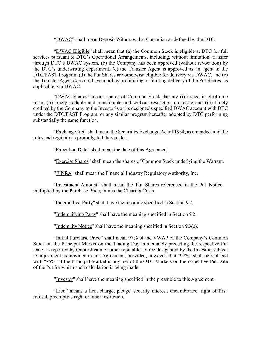 “DWAC” shall mean Deposit Withdrawal at Custodian as defined by the DTC. “DWAC Eligible” shall mean that (a) the Common Stock is eligible at DTC for full services pursuant to DTC’s Operational Arrangements, including, without limitation, transfer through DTC’s DWAC system, (b) the Company has been approved (without revocation) by the DTC’s underwriting department, (c) the Transfer Agent is approved as an agent in the DTC/FAST Program, (d) the Put Shares are otherwise eligible for delivery via DWAC, and (e) the Transfer Agent does not have a policy prohibiting or limiting delivery of the Put Shares, as applicable, via DWAC. “DWAC Shares” means shares of Common Stock that are (i) issued in electronic form, (ii) freely tradable and transferable and without restriction on resale and (iii) timely credited by the Company to the Investor’s or its designee’s specified DWAC account with DTC under the DTC/FAST Program, or any similar program hereafter adopted by DTC performing substantially the same function. "Exchange Act" shall mean the Securities Exchange Act of 1934, as amended, and the rules and regulations promulgated thereunder. "Execution Date" shall mean the date of this Agreement. “Exercise Shares” shall mean the shares of Common Stock underlying the Warrant. "FINRA" shall mean the Financial Industry Regulatory Authority, Inc. "Investment Amount" shall mean the Put Shares referenced in the Put Notice multiplied by the Purchase Price, minus the Clearing Costs. "Indemnified Party" shall have the meaning specified in Section 9.2. "Indemnifying Party" shall have the meaning specified in Section 9.2. "Indemnity Notice" shall have the meaning specified in Section 9.3(e). “Initial Purchase Price” shall mean 97% of the VWAP of the Company’s Common Stock on the Principal Market on the Trading Day immediately preceding the respective Put Date, as reported by Quotestream or other reputable source designated by the Investor, subject to adjustment as provided in this Agreement, provided, however, that “97%” shall be replaced with “85%” if the Principal Market is any tier of the OTC Markets on the respective Put Date of the Put for which such calculation is being made. "Investor" shall have the meaning specified in the preamble to this Agreement. “Lien” means a lien, charge, pledge, security interest, encumbrance, right of first refusal, preemptive right or other restriction.