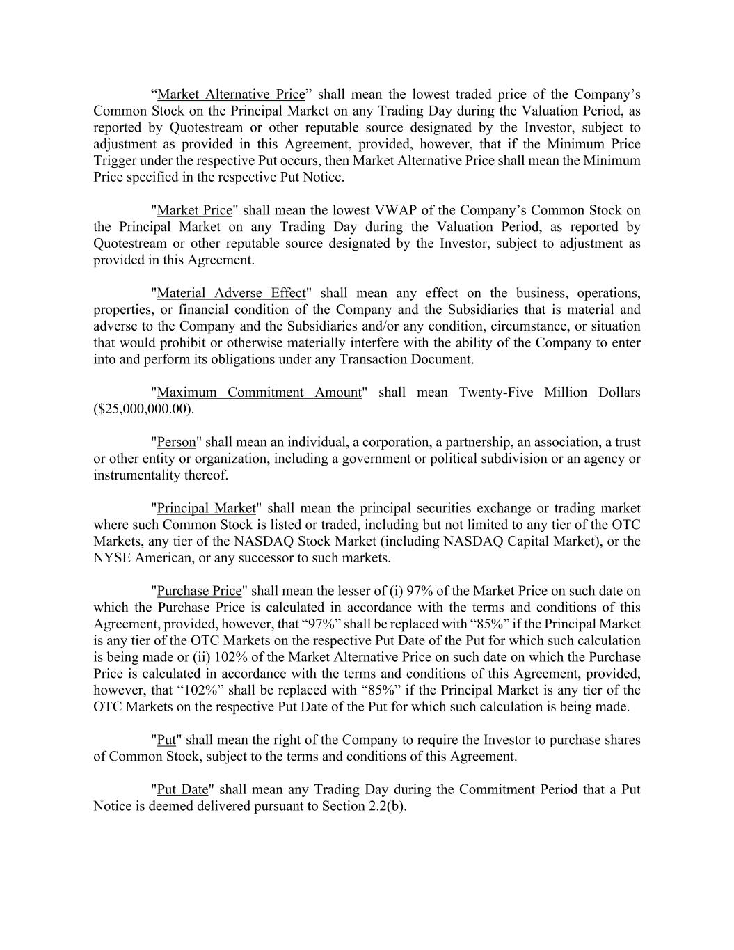 “Market Alternative Price” shall mean the lowest traded price of the Company’s Common Stock on the Principal Market on any Trading Day during the Valuation Period, as reported by Quotestream or other reputable source designated by the Investor, subject to adjustment as provided in this Agreement, provided, however, that if the Minimum Price Trigger under the respective Put occurs, then Market Alternative Price shall mean the Minimum Price specified in the respective Put Notice. "Market Price" shall mean the lowest VWAP of the Company’s Common Stock on the Principal Market on any Trading Day during the Valuation Period, as reported by Quotestream or other reputable source designated by the Investor, subject to adjustment as provided in this Agreement. "Material Adverse Effect" shall mean any effect on the business, operations, properties, or financial condition of the Company and the Subsidiaries that is material and adverse to the Company and the Subsidiaries and/or any condition, circumstance, or situation that would prohibit or otherwise materially interfere with the ability of the Company to enter into and perform its obligations under any Transaction Document. "Maximum Commitment Amount" shall mean Twenty-Five Million Dollars ($25,000,000.00). "Person" shall mean an individual, a corporation, a partnership, an association, a trust or other entity or organization, including a government or political subdivision or an agency or instrumentality thereof. "Principal Market" shall mean the principal securities exchange or trading market where such Common Stock is listed or traded, including but not limited to any tier of the OTC Markets, any tier of the NASDAQ Stock Market (including NASDAQ Capital Market), or the NYSE American, or any successor to such markets. "Purchase Price" shall mean the lesser of (i) 97% of the Market Price on such date on which the Purchase Price is calculated in accordance with the terms and conditions of this Agreement, provided, however, that “97%” shall be replaced with “85%” if the Principal Market is any tier of the OTC Markets on the respective Put Date of the Put for which such calculation is being made or (ii) 102% of the Market Alternative Price on such date on which the Purchase Price is calculated in accordance with the terms and conditions of this Agreement, provided, however, that “102%” shall be replaced with “85%” if the Principal Market is any tier of the OTC Markets on the respective Put Date of the Put for which such calculation is being made. "Put" shall mean the right of the Company to require the Investor to purchase shares of Common Stock, subject to the terms and conditions of this Agreement. "Put Date" shall mean any Trading Day during the Commitment Period that a Put Notice is deemed delivered pursuant to Section 2.2(b).
