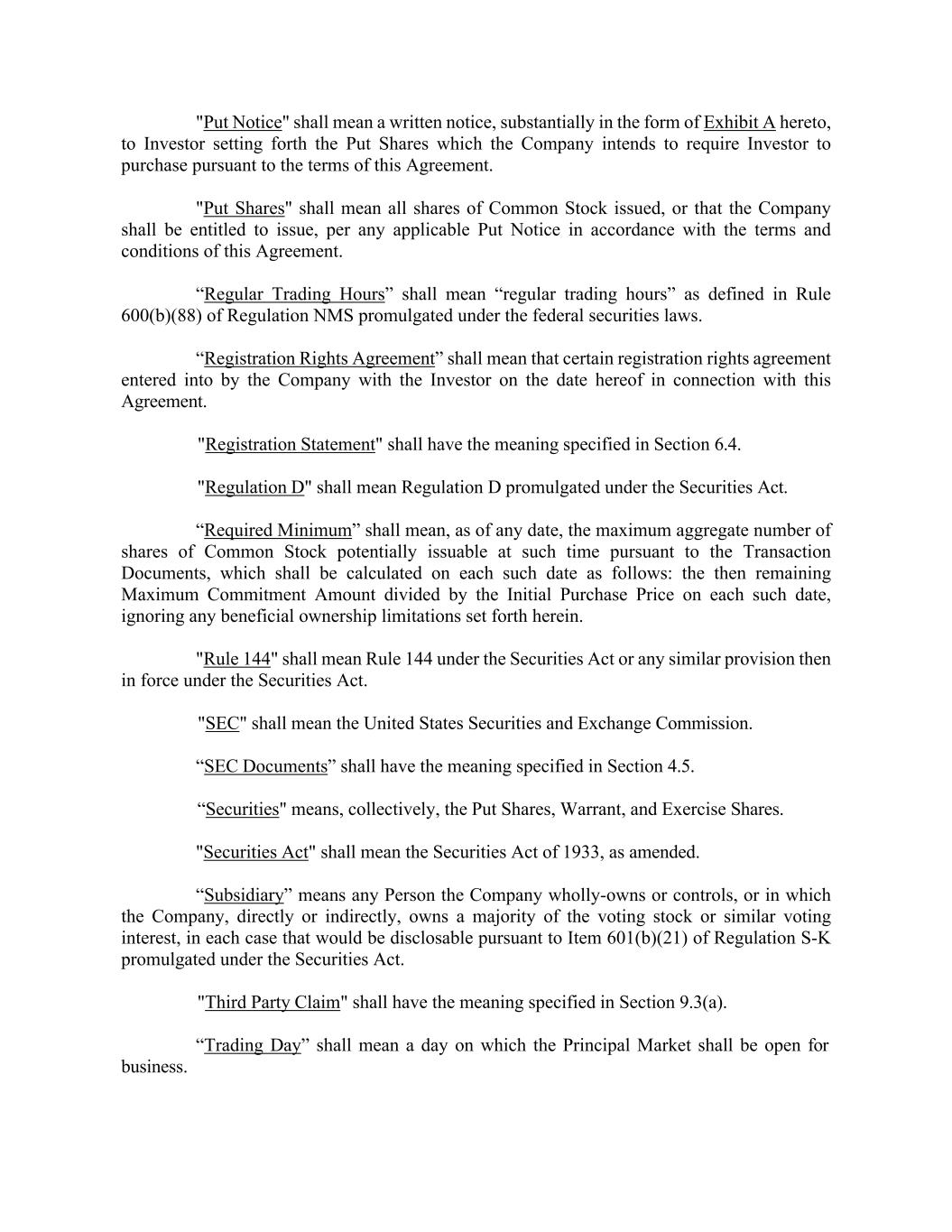 "Put Notice" shall mean a written notice, substantially in the form of Exhibit A hereto, to Investor setting forth the Put Shares which the Company intends to require Investor to purchase pursuant to the terms of this Agreement. "Put Shares" shall mean all shares of Common Stock issued, or that the Company shall be entitled to issue, per any applicable Put Notice in accordance with the terms and conditions of this Agreement. “Regular Trading Hours” shall mean “regular trading hours” as defined in Rule 600(b)(88) of Regulation NMS promulgated under the federal securities laws. “Registration Rights Agreement” shall mean that certain registration rights agreement entered into by the Company with the Investor on the date hereof in connection with this Agreement. "Registration Statement" shall have the meaning specified in Section 6.4. "Regulation D" shall mean Regulation D promulgated under the Securities Act. “Required Minimum” shall mean, as of any date, the maximum aggregate number of shares of Common Stock potentially issuable at such time pursuant to the Transaction Documents, which shall be calculated on each such date as follows: the then remaining Maximum Commitment Amount divided by the Initial Purchase Price on each such date, ignoring any beneficial ownership limitations set forth herein. "Rule 144" shall mean Rule 144 under the Securities Act or any similar provision then in force under the Securities Act. "SEC" shall mean the United States Securities and Exchange Commission. “SEC Documents” shall have the meaning specified in Section 4.5. “Securities" means, collectively, the Put Shares, Warrant, and Exercise Shares. "Securities Act" shall mean the Securities Act of 1933, as amended. “Subsidiary” means any Person the Company wholly-owns or controls, or in which the Company, directly or indirectly, owns a majority of the voting stock or similar voting interest, in each case that would be disclosable pursuant to Item 601(b)(21) of Regulation S-K promulgated under the Securities Act. "Third Party Claim" shall have the meaning specified in Section 9.3(a). “Trading Day” shall mean a day on which the Principal Market shall be open for business.