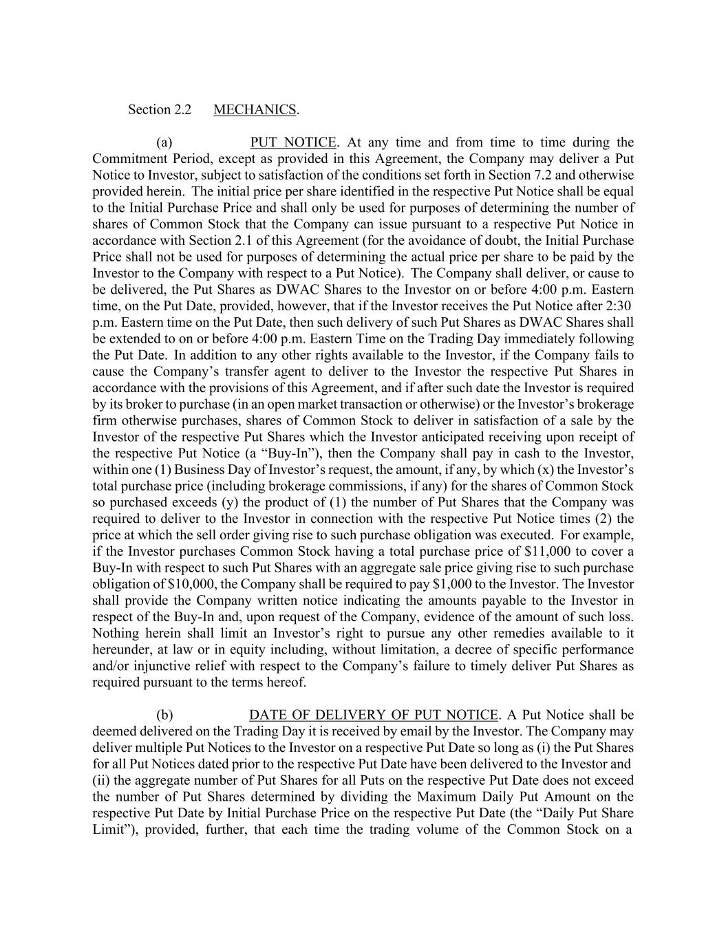 Section 2.2 MECHANICS. (a) PUT NOTICE. At any time and from time to time during the Commitment Period, except as provided in this Agreement, the Company may deliver a Put Notice to Investor, subject to satisfaction of the conditions set forth in Section 7.2 and otherwise provided herein. The initial price per share identified in the respective Put Notice shall be equal to the Initial Purchase Price and shall only be used for purposes of determining the number of shares of Common Stock that the Company can issue pursuant to a respective Put Notice in accordance with Section 2.1 of this Agreement (for the avoidance of doubt, the Initial Purchase Price shall not be used for purposes of determining the actual price per share to be paid by the Investor to the Company with respect to a Put Notice). The Company shall deliver, or cause to be delivered, the Put Shares as DWAC Shares to the Investor on or before 4:00 p.m. Eastern time, on the Put Date, provided, however, that if the Investor receives the Put Notice after 2:30 p.m. Eastern time on the Put Date, then such delivery of such Put Shares as DWAC Shares shall be extended to on or before 4:00 p.m. Eastern Time on the Trading Day immediately following the Put Date. In addition to any other rights available to the Investor, if the Company fails to cause the Company’s transfer agent to deliver to the Investor the respective Put Shares in accordance with the provisions of this Agreement, and if after such date the Investor is required by its broker to purchase (in an open market transaction or otherwise) or the Investor’s brokerage firm otherwise purchases, shares of Common Stock to deliver in satisfaction of a sale by the Investor of the respective Put Shares which the Investor anticipated receiving upon receipt of the respective Put Notice (a “Buy-In”), then the Company shall pay in cash to the Investor, within one (1) Business Day of Investor’s request, the amount, if any, by which (x) the Investor’s total purchase price (including brokerage commissions, if any) for the shares of Common Stock so purchased exceeds (y) the product of (1) the number of Put Shares that the Company was required to deliver to the Investor in connection with the respective Put Notice times (2) the price at which the sell order giving rise to such purchase obligation was executed. For example, if the Investor purchases Common Stock having a total purchase price of $11,000 to cover a Buy-In with respect to such Put Shares with an aggregate sale price giving rise to such purchase obligation of $10,000, the Company shall be required to pay $1,000 to the Investor. The Investor shall provide the Company written notice indicating the amounts payable to the Investor in respect of the Buy-In and, upon request of the Company, evidence of the amount of such loss. Nothing herein shall limit an Investor’s right to pursue any other remedies available to it hereunder, at law or in equity including, without limitation, a decree of specific performance and/or injunctive relief with respect to the Company’s failure to timely deliver Put Shares as required pursuant to the terms hereof. (b) DATE OF DELIVERY OF PUT NOTICE. A Put Notice shall be deemed delivered on the Trading Day it is received by email by the Investor. The Company may deliver multiple Put Notices to the Investor on a respective Put Date so long as (i) the Put Shares for all Put Notices dated prior to the respective Put Date have been delivered to the Investor and (ii) the aggregate number of Put Shares for all Puts on the respective Put Date does not exceed the number of Put Shares determined by dividing the Maximum Daily Put Amount on the respective Put Date by Initial Purchase Price on the respective Put Date (the “Daily Put Share Limit”), provided, further, that each time the trading volume of the Common Stock on a