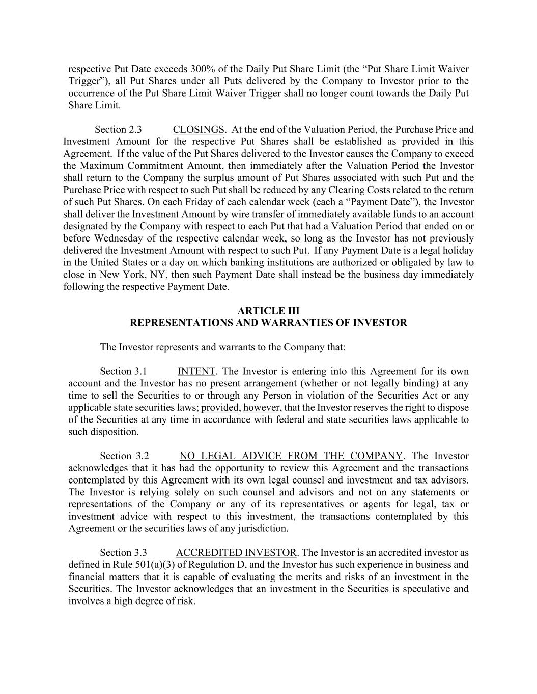 respective Put Date exceeds 300% of the Daily Put Share Limit (the “Put Share Limit Waiver Trigger”), all Put Shares under all Puts delivered by the Company to Investor prior to the occurrence of the Put Share Limit Waiver Trigger shall no longer count towards the Daily Put Share Limit. Section 2.3 CLOSINGS. At the end of the Valuation Period, the Purchase Price and Investment Amount for the respective Put Shares shall be established as provided in this Agreement. If the value of the Put Shares delivered to the Investor causes the Company to exceed the Maximum Commitment Amount, then immediately after the Valuation Period the Investor shall return to the Company the surplus amount of Put Shares associated with such Put and the Purchase Price with respect to such Put shall be reduced by any Clearing Costs related to the return of such Put Shares. On each Friday of each calendar week (each a “Payment Date”), the Investor shall deliver the Investment Amount by wire transfer of immediately available funds to an account designated by the Company with respect to each Put that had a Valuation Period that ended on or before Wednesday of the respective calendar week, so long as the Investor has not previously delivered the Investment Amount with respect to such Put. If any Payment Date is a legal holiday in the United States or a day on which banking institutions are authorized or obligated by law to close in New York, NY, then such Payment Date shall instead be the business day immediately following the respective Payment Date. ARTICLE III REPRESENTATIONS AND WARRANTIES OF INVESTOR The Investor represents and warrants to the Company that: Section 3.1 INTENT. The Investor is entering into this Agreement for its own account and the Investor has no present arrangement (whether or not legally binding) at any time to sell the Securities to or through any Person in violation of the Securities Act or any applicable state securities laws; provided, however, that the Investor reserves the right to dispose of the Securities at any time in accordance with federal and state securities laws applicable to such disposition. Section 3.2 NO LEGAL ADVICE FROM THE COMPANY. The Investor acknowledges that it has had the opportunity to review this Agreement and the transactions contemplated by this Agreement with its own legal counsel and investment and tax advisors. The Investor is relying solely on such counsel and advisors and not on any statements or representations of the Company or any of its representatives or agents for legal, tax or investment advice with respect to this investment, the transactions contemplated by this Agreement or the securities laws of any jurisdiction. Section 3.3 ACCREDITED INVESTOR. The Investor is an accredited investor as defined in Rule 501(a)(3) of Regulation D, and the Investor has such experience in business and financial matters that it is capable of evaluating the merits and risks of an investment in the Securities. The Investor acknowledges that an investment in the Securities is speculative and involves a high degree of risk.