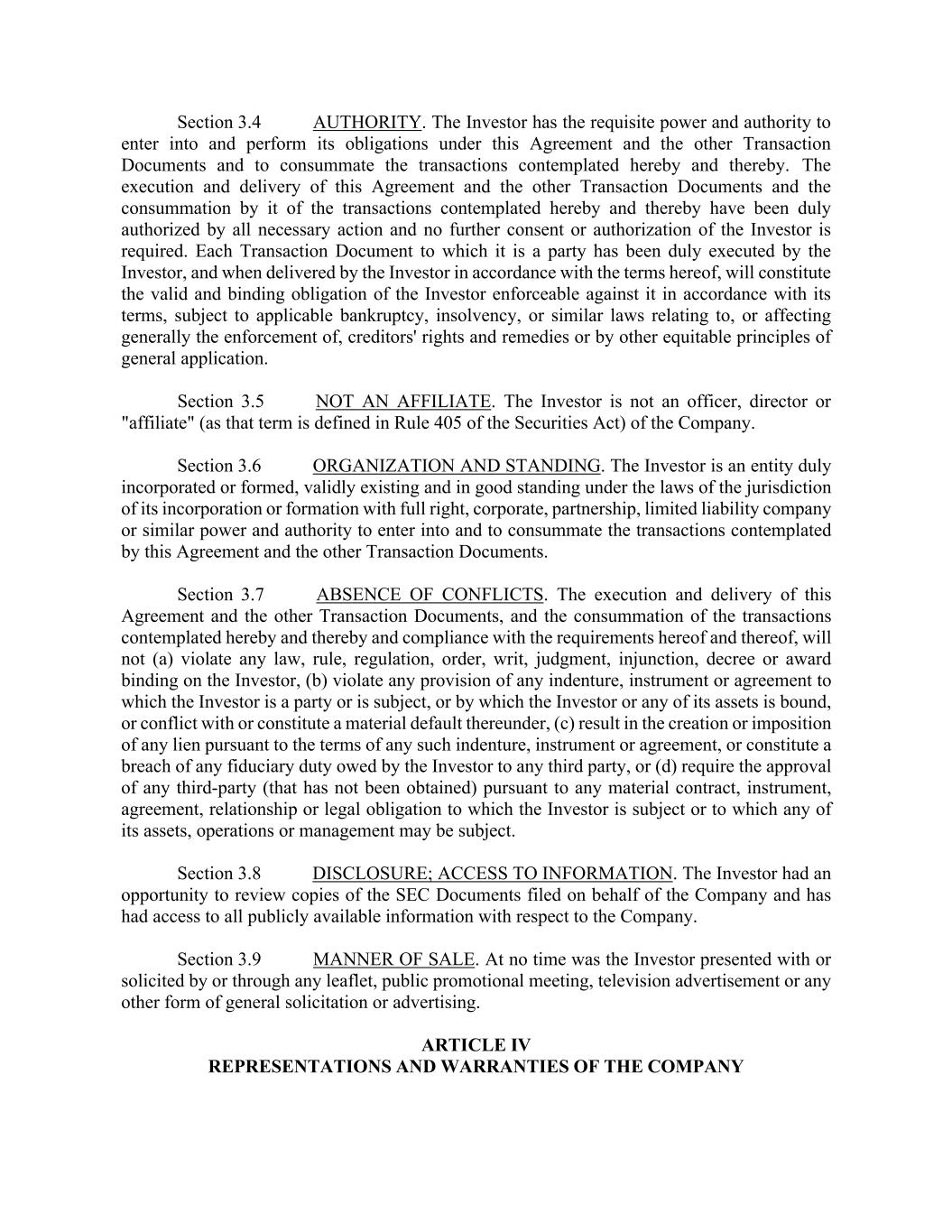 Section 3.4 AUTHORITY. The Investor has the requisite power and authority to enter into and perform its obligations under this Agreement and the other Transaction Documents and to consummate the transactions contemplated hereby and thereby. The execution and delivery of this Agreement and the other Transaction Documents and the consummation by it of the transactions contemplated hereby and thereby have been duly authorized by all necessary action and no further consent or authorization of the Investor is required. Each Transaction Document to which it is a party has been duly executed by the Investor, and when delivered by the Investor in accordance with the terms hereof, will constitute the valid and binding obligation of the Investor enforceable against it in accordance with its terms, subject to applicable bankruptcy, insolvency, or similar laws relating to, or affecting generally the enforcement of, creditors' rights and remedies or by other equitable principles of general application. Section 3.5 NOT AN AFFILIATE. The Investor is not an officer, director or "affiliate" (as that term is defined in Rule 405 of the Securities Act) of the Company. Section 3.6 ORGANIZATION AND STANDING. The Investor is an entity duly incorporated or formed, validly existing and in good standing under the laws of the jurisdiction of its incorporation or formation with full right, corporate, partnership, limited liability company or similar power and authority to enter into and to consummate the transactions contemplated by this Agreement and the other Transaction Documents. Section 3.7 ABSENCE OF CONFLICTS. The execution and delivery of this Agreement and the other Transaction Documents, and the consummation of the transactions contemplated hereby and thereby and compliance with the requirements hereof and thereof, will not (a) violate any law, rule, regulation, order, writ, judgment, injunction, decree or award binding on the Investor, (b) violate any provision of any indenture, instrument or agreement to which the Investor is a party or is subject, or by which the Investor or any of its assets is bound, or conflict with or constitute a material default thereunder, (c) result in the creation or imposition of any lien pursuant to the terms of any such indenture, instrument or agreement, or constitute a breach of any fiduciary duty owed by the Investor to any third party, or (d) require the approval of any third-party (that has not been obtained) pursuant to any material contract, instrument, agreement, relationship or legal obligation to which the Investor is subject or to which any of its assets, operations or management may be subject. Section 3.8 DISCLOSURE; ACCESS TO INFORMATION. The Investor had an opportunity to review copies of the SEC Documents filed on behalf of the Company and has had access to all publicly available information with respect to the Company. Section 3.9 MANNER OF SALE. At no time was the Investor presented with or solicited by or through any leaflet, public promotional meeting, television advertisement or any other form of general solicitation or advertising. ARTICLE IV REPRESENTATIONS AND WARRANTIES OF THE COMPANY