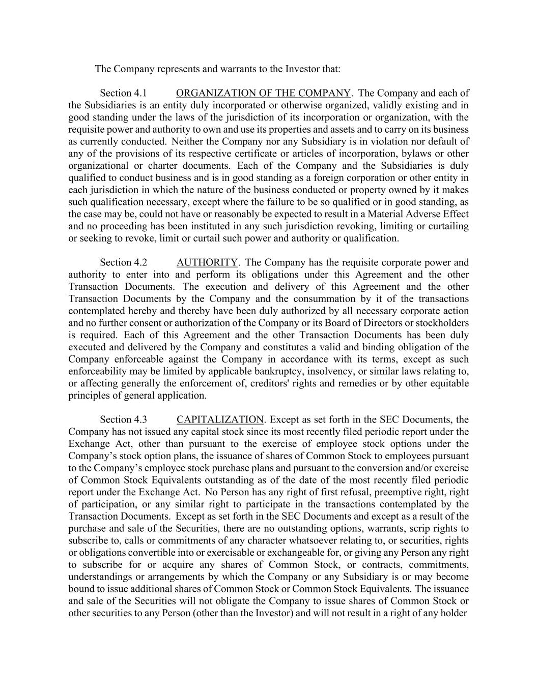The Company represents and warrants to the Investor that: Section 4.1 ORGANIZATION OF THE COMPANY. The Company and each of the Subsidiaries is an entity duly incorporated or otherwise organized, validly existing and in good standing under the laws of the jurisdiction of its incorporation or organization, with the requisite power and authority to own and use its properties and assets and to carry on its business as currently conducted. Neither the Company nor any Subsidiary is in violation nor default of any of the provisions of its respective certificate or articles of incorporation, bylaws or other organizational or charter documents. Each of the Company and the Subsidiaries is duly qualified to conduct business and is in good standing as a foreign corporation or other entity in each jurisdiction in which the nature of the business conducted or property owned by it makes such qualification necessary, except where the failure to be so qualified or in good standing, as the case may be, could not have or reasonably be expected to result in a Material Adverse Effect and no proceeding has been instituted in any such jurisdiction revoking, limiting or curtailing or seeking to revoke, limit or curtail such power and authority or qualification. Section 4.2 AUTHORITY. The Company has the requisite corporate power and authority to enter into and perform its obligations under this Agreement and the other Transaction Documents. The execution and delivery of this Agreement and the other Transaction Documents by the Company and the consummation by it of the transactions contemplated hereby and thereby have been duly authorized by all necessary corporate action and no further consent or authorization of the Company or its Board of Directors or stockholders is required. Each of this Agreement and the other Transaction Documents has been duly executed and delivered by the Company and constitutes a valid and binding obligation of the Company enforceable against the Company in accordance with its terms, except as such enforceability may be limited by applicable bankruptcy, insolvency, or similar laws relating to, or affecting generally the enforcement of, creditors' rights and remedies or by other equitable principles of general application. Section 4.3 CAPITALIZATION. Except as set forth in the SEC Documents, the Company has not issued any capital stock since its most recently filed periodic report under the Exchange Act, other than pursuant to the exercise of employee stock options under the Company’s stock option plans, the issuance of shares of Common Stock to employees pursuant to the Company’s employee stock purchase plans and pursuant to the conversion and/or exercise of Common Stock Equivalents outstanding as of the date of the most recently filed periodic report under the Exchange Act. No Person has any right of first refusal, preemptive right, right of participation, or any similar right to participate in the transactions contemplated by the Transaction Documents. Except as set forth in the SEC Documents and except as a result of the purchase and sale of the Securities, there are no outstanding options, warrants, scrip rights to subscribe to, calls or commitments of any character whatsoever relating to, or securities, rights or obligations convertible into or exercisable or exchangeable for, or giving any Person any right to subscribe for or acquire any shares of Common Stock, or contracts, commitments, understandings or arrangements by which the Company or any Subsidiary is or may become bound to issue additional shares of Common Stock or Common Stock Equivalents. The issuance and sale of the Securities will not obligate the Company to issue shares of Common Stock or other securities to any Person (other than the Investor) and will not result in a right of any holder