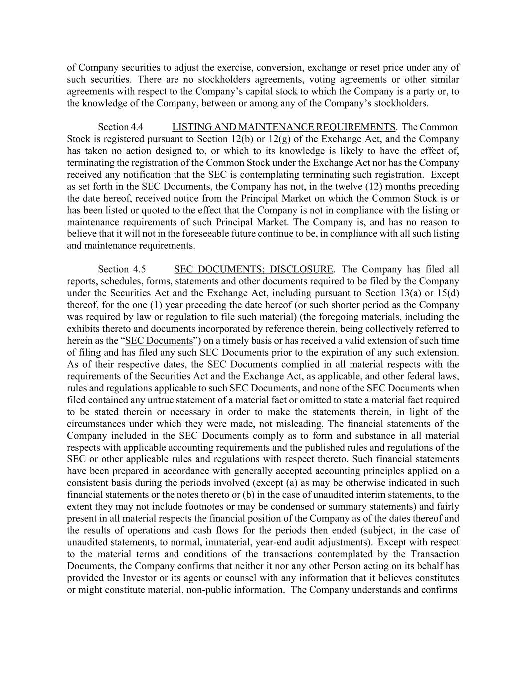 of Company securities to adjust the exercise, conversion, exchange or reset price under any of such securities. There are no stockholders agreements, voting agreements or other similar agreements with respect to the Company’s capital stock to which the Company is a party or, to the knowledge of the Company, between or among any of the Company’s stockholders. Section 4.4 LISTING AND MAINTENANCE REQUIREMENTS. The Common Stock is registered pursuant to Section 12(b) or 12(g) of the Exchange Act, and the Company has taken no action designed to, or which to its knowledge is likely to have the effect of, terminating the registration of the Common Stock under the Exchange Act nor has the Company received any notification that the SEC is contemplating terminating such registration. Except as set forth in the SEC Documents, the Company has not, in the twelve (12) months preceding the date hereof, received notice from the Principal Market on which the Common Stock is or has been listed or quoted to the effect that the Company is not in compliance with the listing or maintenance requirements of such Principal Market. The Company is, and has no reason to believe that it will not in the foreseeable future continue to be, in compliance with all such listing and maintenance requirements. Section 4.5 SEC DOCUMENTS; DISCLOSURE. The Company has filed all reports, schedules, forms, statements and other documents required to be filed by the Company under the Securities Act and the Exchange Act, including pursuant to Section 13(a) or 15(d) thereof, for the one (1) year preceding the date hereof (or such shorter period as the Company was required by law or regulation to file such material) (the foregoing materials, including the exhibits thereto and documents incorporated by reference therein, being collectively referred to herein as the “SEC Documents”) on a timely basis or has received a valid extension of such time of filing and has filed any such SEC Documents prior to the expiration of any such extension. As of their respective dates, the SEC Documents complied in all material respects with the requirements of the Securities Act and the Exchange Act, as applicable, and other federal laws, rules and regulations applicable to such SEC Documents, and none of the SEC Documents when filed contained any untrue statement of a material fact or omitted to state a material fact required to be stated therein or necessary in order to make the statements therein, in light of the circumstances under which they were made, not misleading. The financial statements of the Company included in the SEC Documents comply as to form and substance in all material respects with applicable accounting requirements and the published rules and regulations of the SEC or other applicable rules and regulations with respect thereto. Such financial statements have been prepared in accordance with generally accepted accounting principles applied on a consistent basis during the periods involved (except (a) as may be otherwise indicated in such financial statements or the notes thereto or (b) in the case of unaudited interim statements, to the extent they may not include footnotes or may be condensed or summary statements) and fairly present in all material respects the financial position of the Company as of the dates thereof and the results of operations and cash flows for the periods then ended (subject, in the case of unaudited statements, to normal, immaterial, year-end audit adjustments). Except with respect to the material terms and conditions of the transactions contemplated by the Transaction Documents, the Company confirms that neither it nor any other Person acting on its behalf has provided the Investor or its agents or counsel with any information that it believes constitutes or might constitute material, non-public information. The Company understands and confirms