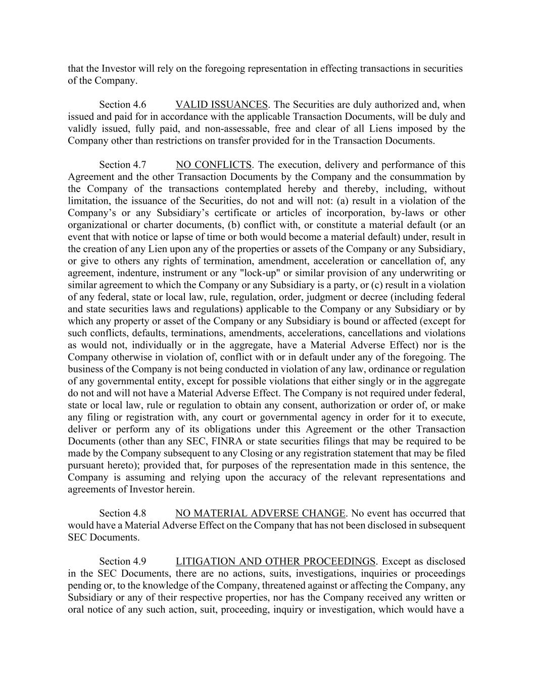 that the Investor will rely on the foregoing representation in effecting transactions in securities of the Company. Section 4.6 VALID ISSUANCES. The Securities are duly authorized and, when issued and paid for in accordance with the applicable Transaction Documents, will be duly and validly issued, fully paid, and non-assessable, free and clear of all Liens imposed by the Company other than restrictions on transfer provided for in the Transaction Documents. Section 4.7 NO CONFLICTS. The execution, delivery and performance of this Agreement and the other Transaction Documents by the Company and the consummation by the Company of the transactions contemplated hereby and thereby, including, without limitation, the issuance of the Securities, do not and will not: (a) result in a violation of the Company’s or any Subsidiary’s certificate or articles of incorporation, by-laws or other organizational or charter documents, (b) conflict with, or constitute a material default (or an event that with notice or lapse of time or both would become a material default) under, result in the creation of any Lien upon any of the properties or assets of the Company or any Subsidiary, or give to others any rights of termination, amendment, acceleration or cancellation of, any agreement, indenture, instrument or any "lock-up" or similar provision of any underwriting or similar agreement to which the Company or any Subsidiary is a party, or (c) result in a violation of any federal, state or local law, rule, regulation, order, judgment or decree (including federal and state securities laws and regulations) applicable to the Company or any Subsidiary or by which any property or asset of the Company or any Subsidiary is bound or affected (except for such conflicts, defaults, terminations, amendments, accelerations, cancellations and violations as would not, individually or in the aggregate, have a Material Adverse Effect) nor is the Company otherwise in violation of, conflict with or in default under any of the foregoing. The business of the Company is not being conducted in violation of any law, ordinance or regulation of any governmental entity, except for possible violations that either singly or in the aggregate do not and will not have a Material Adverse Effect. The Company is not required under federal, state or local law, rule or regulation to obtain any consent, authorization or order of, or make any filing or registration with, any court or governmental agency in order for it to execute, deliver or perform any of its obligations under this Agreement or the other Transaction Documents (other than any SEC, FINRA or state securities filings that may be required to be made by the Company subsequent to any Closing or any registration statement that may be filed pursuant hereto); provided that, for purposes of the representation made in this sentence, the Company is assuming and relying upon the accuracy of the relevant representations and agreements of Investor herein. Section 4.8 NO MATERIAL ADVERSE CHANGE. No event has occurred that would have a Material Adverse Effect on the Company that has not been disclosed in subsequent SEC Documents. Section 4.9 LITIGATION AND OTHER PROCEEDINGS. Except as disclosed in the SEC Documents, there are no actions, suits, investigations, inquiries or proceedings pending or, to the knowledge of the Company, threatened against or affecting the Company, any Subsidiary or any of their respective properties, nor has the Company received any written or oral notice of any such action, suit, proceeding, inquiry or investigation, which would have a