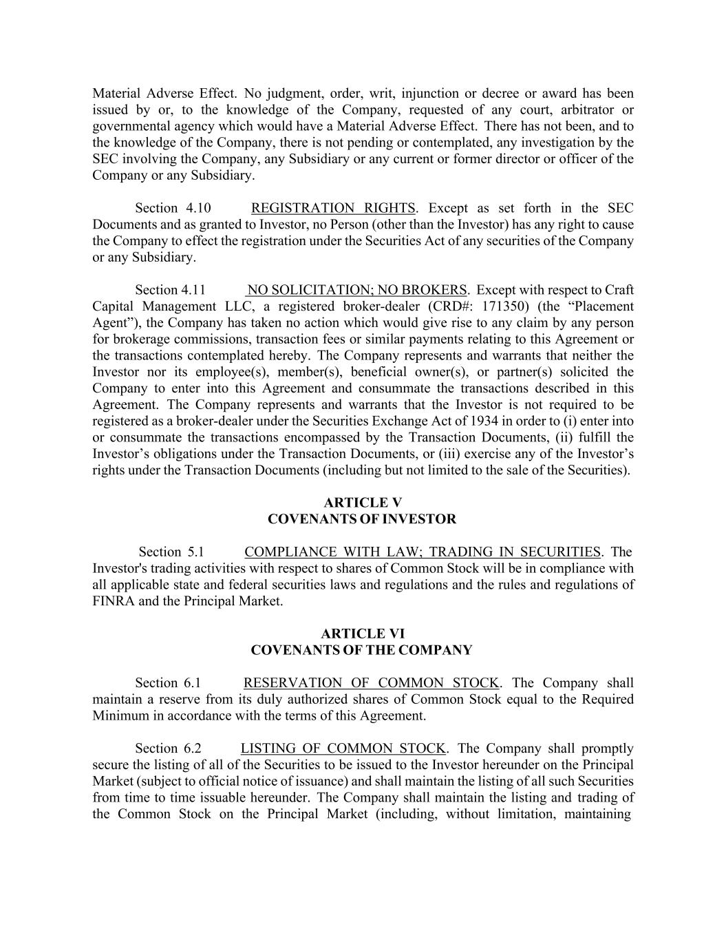 Material Adverse Effect. No judgment, order, writ, injunction or decree or award has been issued by or, to the knowledge of the Company, requested of any court, arbitrator or governmental agency which would have a Material Adverse Effect. There has not been, and to the knowledge of the Company, there is not pending or contemplated, any investigation by the SEC involving the Company, any Subsidiary or any current or former director or officer of the Company or any Subsidiary. Section 4.10 REGISTRATION RIGHTS. Except as set forth in the SEC Documents and as granted to Investor, no Person (other than the Investor) has any right to cause the Company to effect the registration under the Securities Act of any securities of the Company or any Subsidiary. Section 4.11 NO SOLICITATION; NO BROKERS. Except with respect to Craft Capital Management LLC, a registered broker-dealer (CRD#: 171350) (the “Placement Agent”), the Company has taken no action which would give rise to any claim by any person for brokerage commissions, transaction fees or similar payments relating to this Agreement or the transactions contemplated hereby. The Company represents and warrants that neither the Investor nor its employee(s), member(s), beneficial owner(s), or partner(s) solicited the Company to enter into this Agreement and consummate the transactions described in this Agreement. The Company represents and warrants that the Investor is not required to be registered as a broker-dealer under the Securities Exchange Act of 1934 in order to (i) enter into or consummate the transactions encompassed by the Transaction Documents, (ii) fulfill the Investor’s obligations under the Transaction Documents, or (iii) exercise any of the Investor’s rights under the Transaction Documents (including but not limited to the sale of the Securities). ARTICLE V COVENANTS OF INVESTOR Section 5.1 COMPLIANCE WITH LAW; TRADING IN SECURITIES. The Investor's trading activities with respect to shares of Common Stock will be in compliance with all applicable state and federal securities laws and regulations and the rules and regulations of FINRA and the Principal Market. ARTICLE VI COVENANTS OF THE COMPANY Section 6.1 RESERVATION OF COMMON STOCK. The Company shall maintain a reserve from its duly authorized shares of Common Stock equal to the Required Minimum in accordance with the terms of this Agreement. Section 6.2 LISTING OF COMMON STOCK. The Company shall promptly secure the listing of all of the Securities to be issued to the Investor hereunder on the Principal Market (subject to official notice of issuance) and shall maintain the listing of all such Securities from time to time issuable hereunder. The Company shall maintain the listing and trading of the Common Stock on the Principal Market (including, without limitation, maintaining