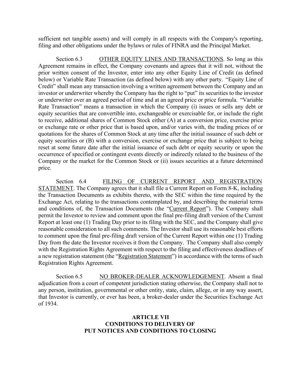 sufficient net tangible assets) and will comply in all respects with the Company's reporting, filing and other obligations under the bylaws or rules of FINRA and the Principal Market. Section 6.3 OTHER EQUITY LINES AND TRANSACTIONS. So long as this Agreement remains in effect, the Company covenants and agrees that it will not, without the prior written consent of the Investor, enter into any other Equity Line of Credit (as defined below) or Variable Rate Transaction (as defined below) with any other party. “Equity Line of Credit” shall mean any transaction involving a written agreement between the Company and an investor or underwriter whereby the Company has the right to “put” its securities to the investor or underwriter over an agreed period of time and at an agreed price or price formula. “Variable Rate Transaction” means a transaction in which the Company (i) issues or sells any debt or equity securities that are convertible into, exchangeable or exercisable for, or include the right to receive, additional shares of Common Stock either (A) at a conversion price, exercise price or exchange rate or other price that is based upon, and/or varies with, the trading prices of or quotations for the shares of Common Stock at any time after the initial issuance of such debt or equity securities or (B) with a conversion, exercise or exchange price that is subject to being reset at some future date after the initial issuance of such debt or equity security or upon the occurrence of specified or contingent events directly or indirectly related to the business of the Company or the market for the Common Stock or (ii) issues securities at a future determined price. Section 6.4 FILING OF CURRENT REPORT AND REGISTRATION STATEMENT. The Company agrees that it shall file a Current Report on Form 8-K, including the Transaction Documents as exhibits thereto, with the SEC within the time required by the Exchange Act, relating to the transactions contemplated by, and describing the material terms and conditions of, the Transaction Documents (the “Current Report”). The Company shall permit the Investor to review and comment upon the final pre-filing draft version of the Current Report at least one (1) Trading Day prior to its filing with the SEC, and the Company shall give reasonable consideration to all such comments. The Investor shall use its reasonable best efforts to comment upon the final pre-filing draft version of the Current Report within one (1) Trading Day from the date the Investor receives it from the Company. The Company shall also comply with the Registration Rights Agreement with respect to the filing and effectiveness deadlines of a new registration statement (the “Registration Statement”) in accordance with the terms of such Registration Rights Agreement. Section 6.5 NO BROKER-DEALER ACKNOWLEDGEMENT. Absent a final adjudication from a court of competent jurisdiction stating otherwise, the Company shall not to any person, institution, governmental or other entity, state, claim, allege, or in any way assert, that Investor is currently, or ever has been, a broker-dealer under the Securities Exchange Act of 1934. ARTICLE VII CONDITIONS TO DELIVERY OF PUT NOTICES AND CONDITIONS TO CLOSING